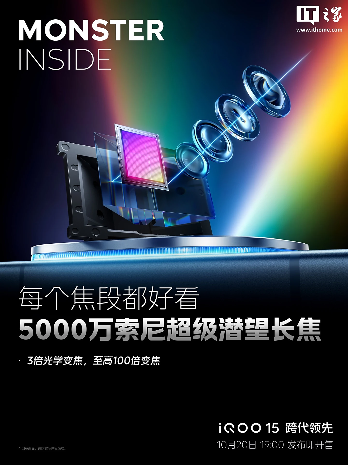 根据 iQOO 官方最新预热,iQOO 15 长焦镜头的部分配置终于揭晓:新机搭载 5000 万索尼超级潜望长焦(具体配置信息暂未公布),支持 3 倍光学变焦、6 倍无损级变焦、至高 100 倍变焦。
