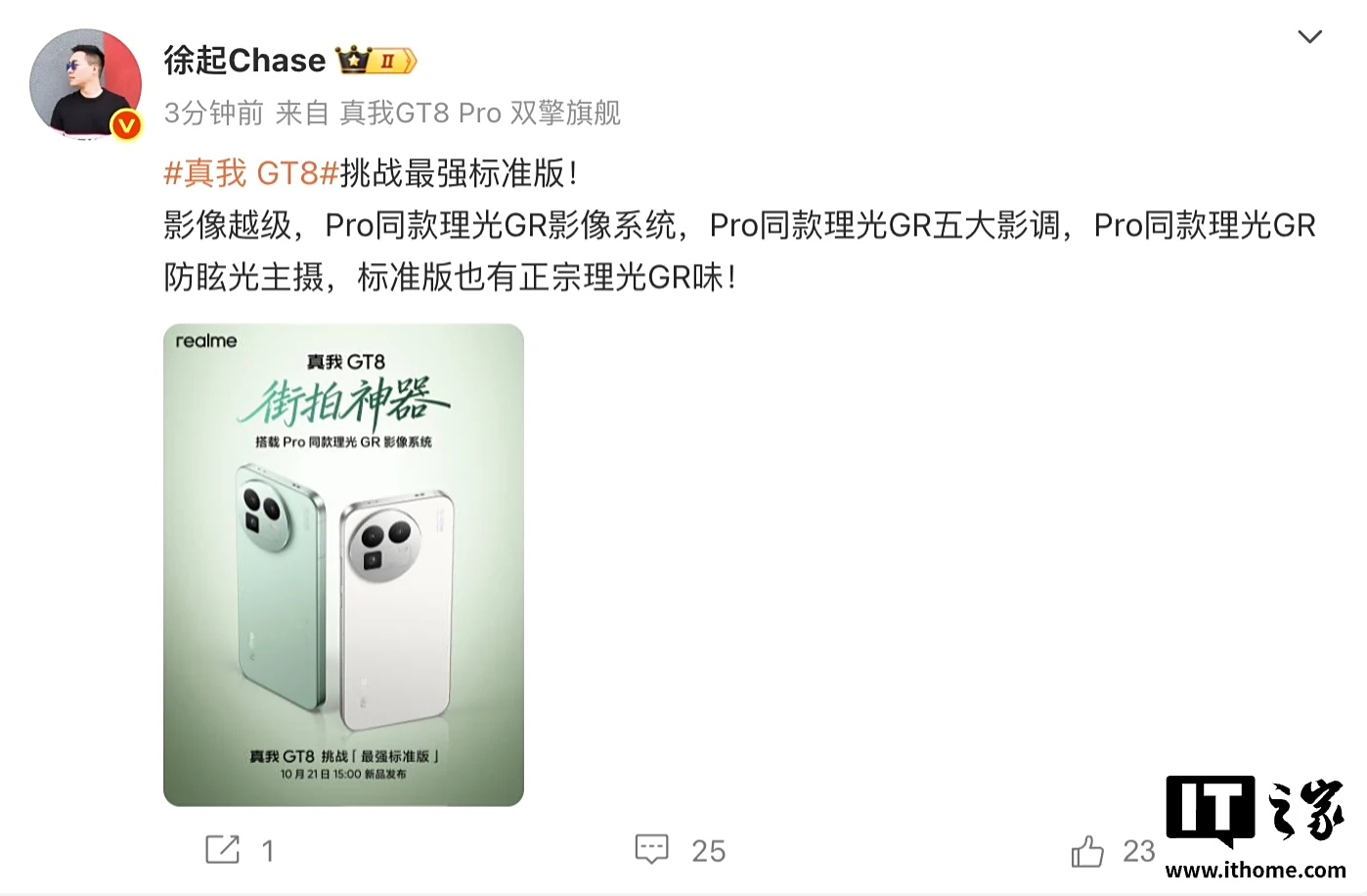 IT之家 10 月 20 日消息,今天上午,真我 realme 副总裁、全球营销总裁、中国区总裁 @徐起Chase 发文宣布:真我 GT8 将搭载 Pro 同款理光 GR 影像系统,拥有 Pro 同款理光 GR 五大影调和理光 GR 防眩光主摄,标准版也有正宗理光 GR 味!