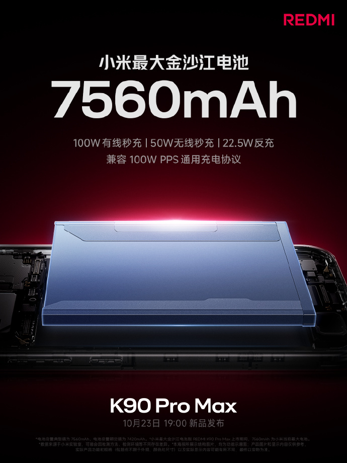 文章来源于互联网:REDMI K90 Pro Max 搭载 7560mAh 小米最大金沙江电池,兼容 100W PPS 充电协议