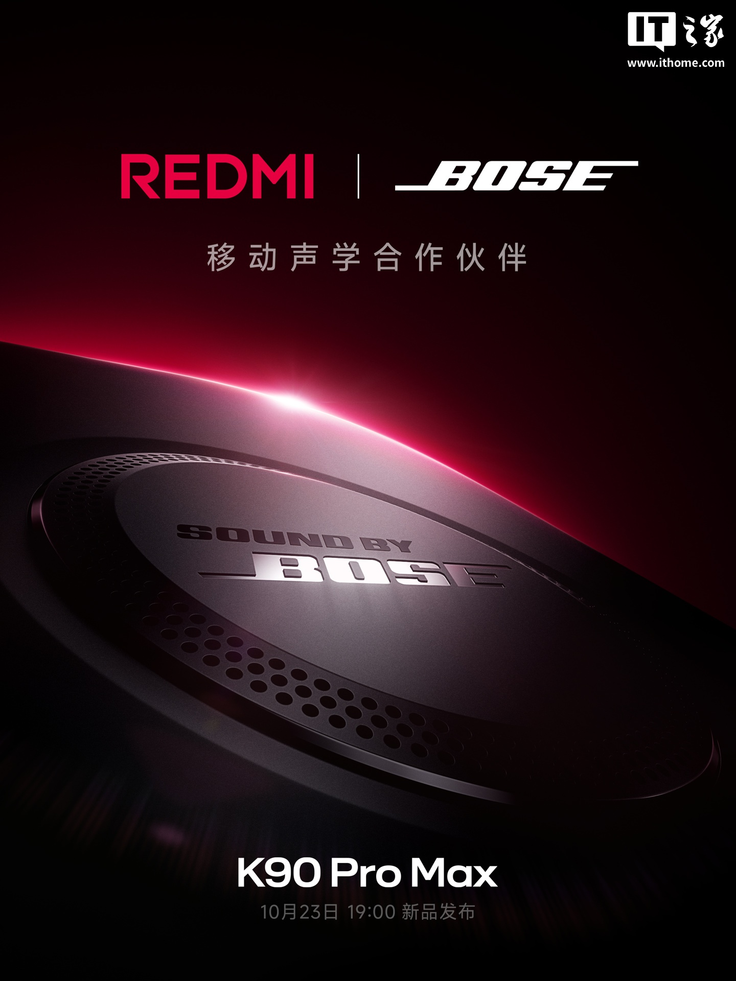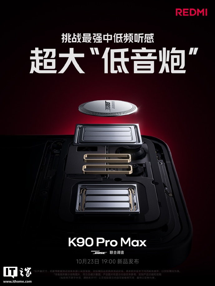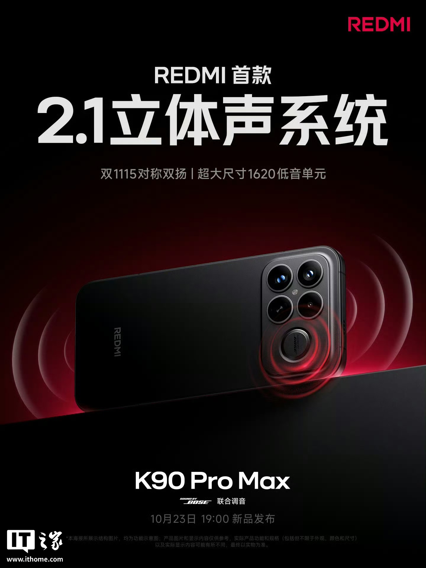 IT之家 10 月 21 日消息,小米 REDMI K90 Pro Max 手机即将于 10 月 23 日 19:00 发布,官方今天预热了新机的扬声器配置。