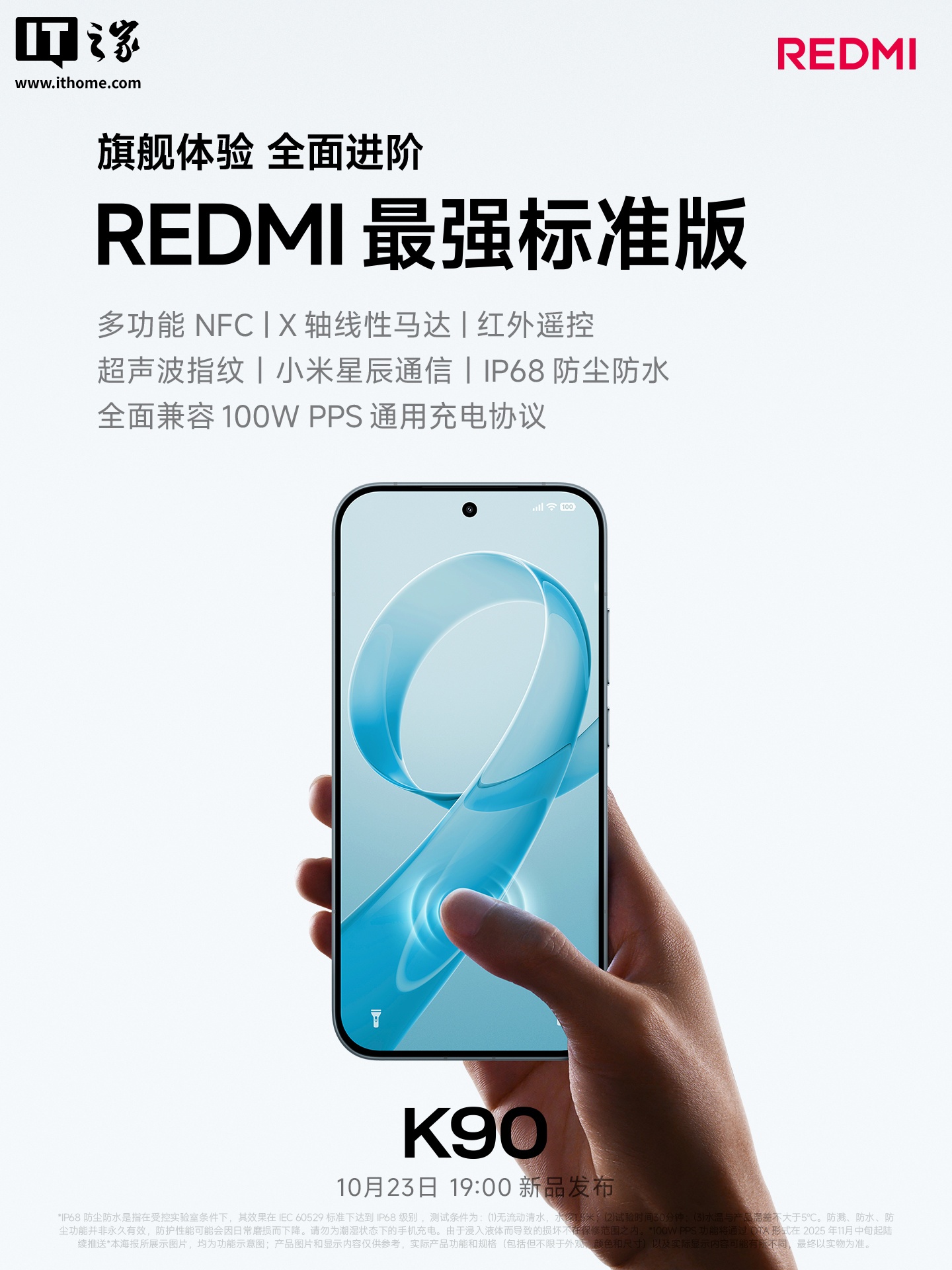 IT之家 10 月 22 日消息,在今天上午官宣 K90 系列新机 10 月 23 日发布的消息之后,REDMI 红米手机就开启了 K90 标准版的预热,新机外观已正式公布:6.59 英寸黄金中尺寸,具备单手易用、大屏娱乐特性。