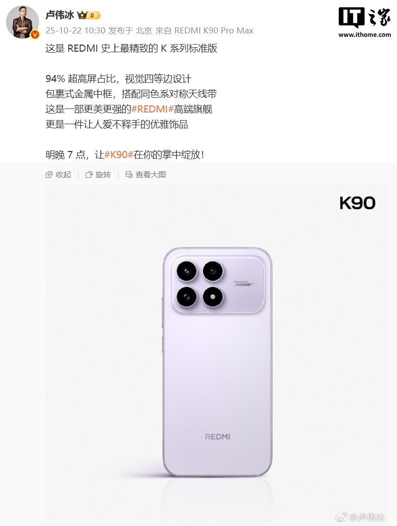 小米集团合伙人、总裁,手机部总裁,小米品牌总经理卢伟冰表示,REDMI K90 标准版是 REDMI 史上最精致的 K 系列标准版。卢伟冰称“REDMI K90 系列是小米手机业务在旗舰新品发布季的第二篇章”。