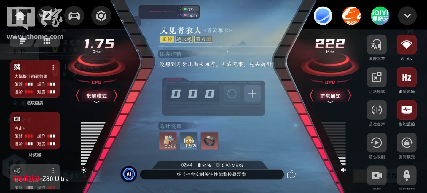但这不是最重要的,如上图所示,通过游戏侧边栏,你可以呼出游戏面板,这里给出了极为丰富的游戏选项。包括各种性能模式的选择,丰富度极高,包括性能监控、全能滤镜、改键位等等,完全是游戏手机的玩法。