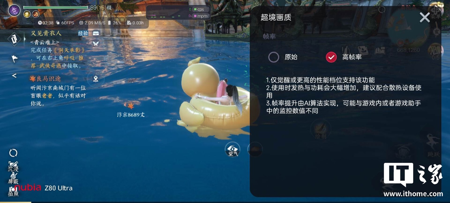 这里以《逆水寒》手游为例,选择非常考验性能的南陀岛地图,这里的画质选择最高全开,包括开启实时光追,帧率选择超高。