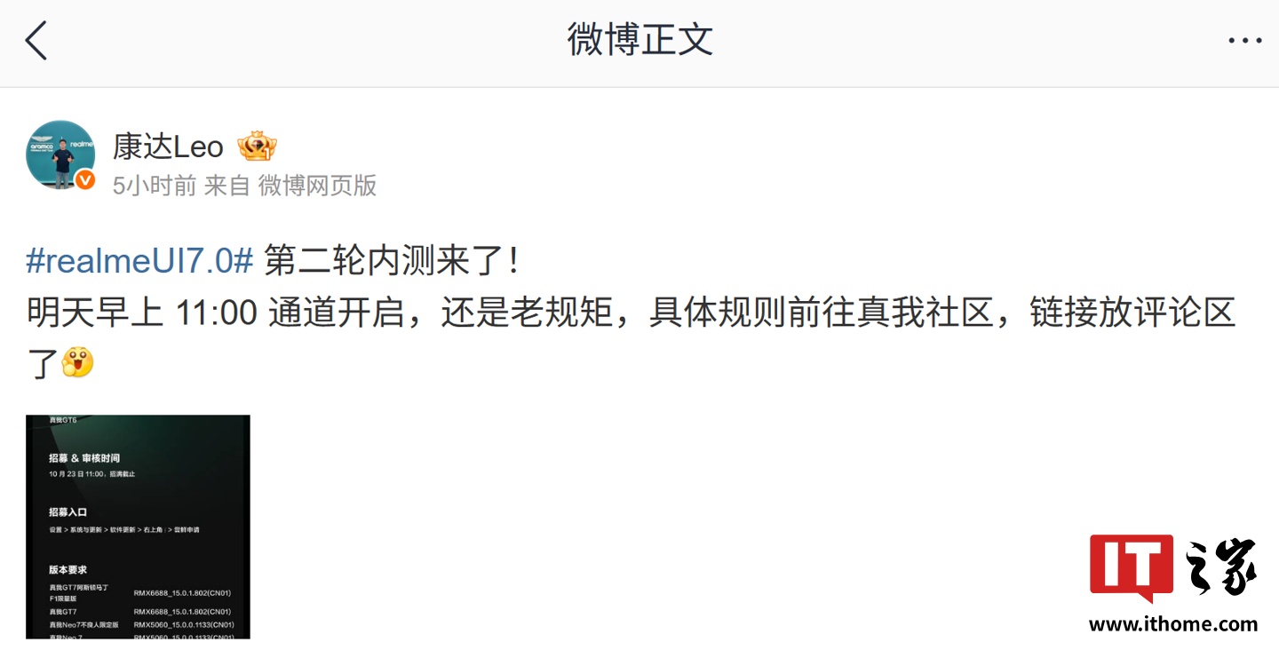 IT之家 10 月 22 日消息,realme UI 产品经理 @康达Leo 今日宣布:realme UI 7.0 第二轮内测用户招募开启,明天早上 11:00 通道开启。