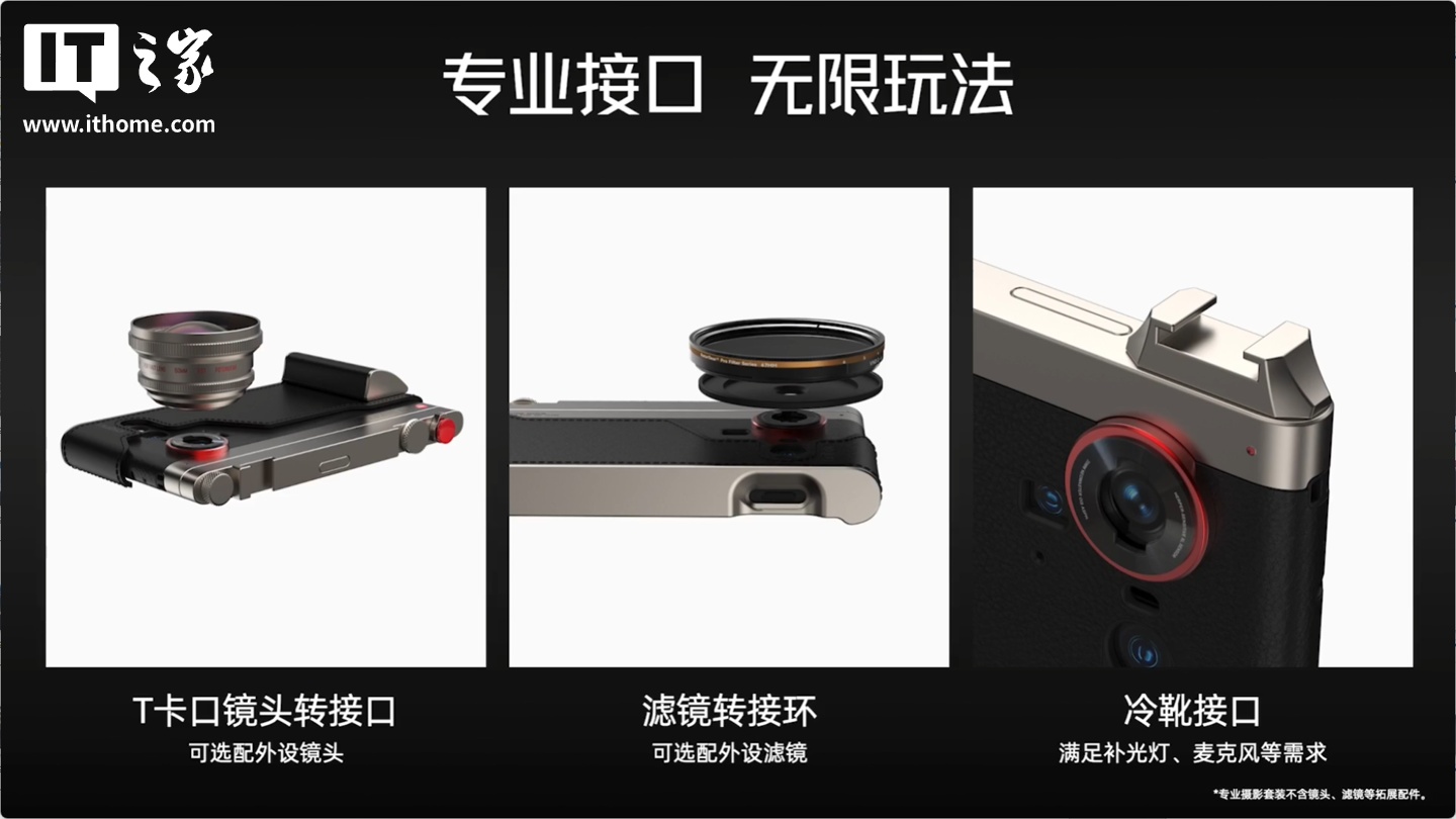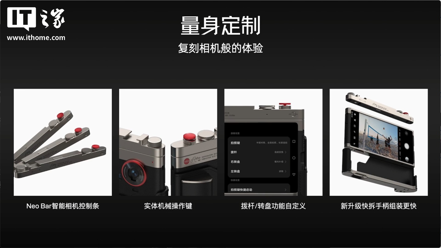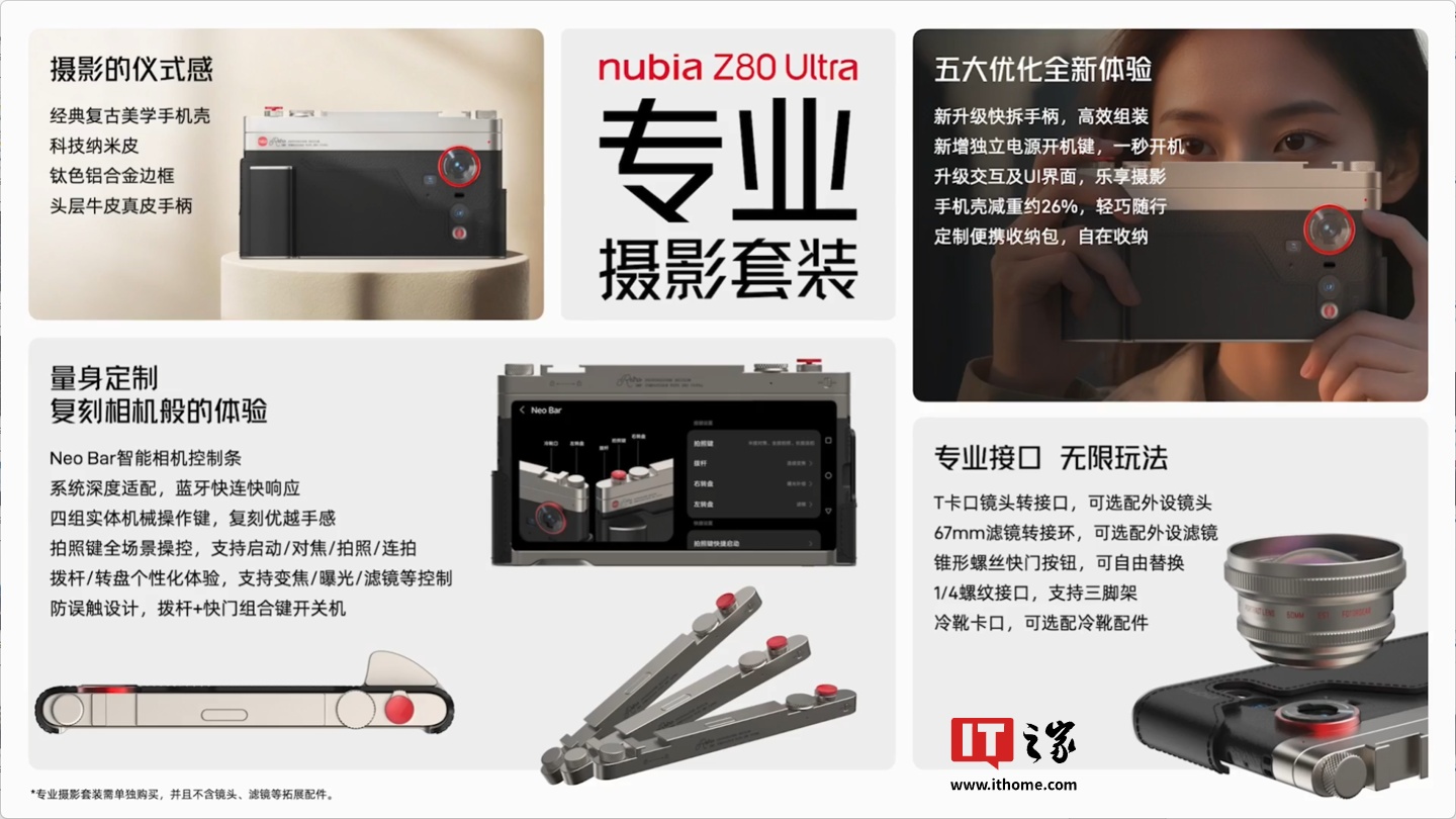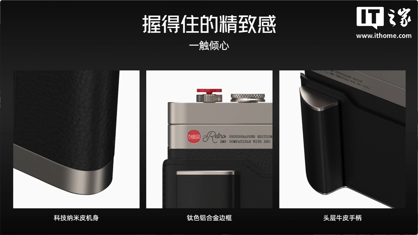 Z80 Ultra 还可以选配“专业摄影套装”,机身采用科技纳米皮材质和钛色铝合金边框,手柄包裹头层牛皮,拥有实体机械操作键、Neo Bar 智能相机控制条,可自定义波轮 / 转盘功能,升级快拆手柄,组装更快。