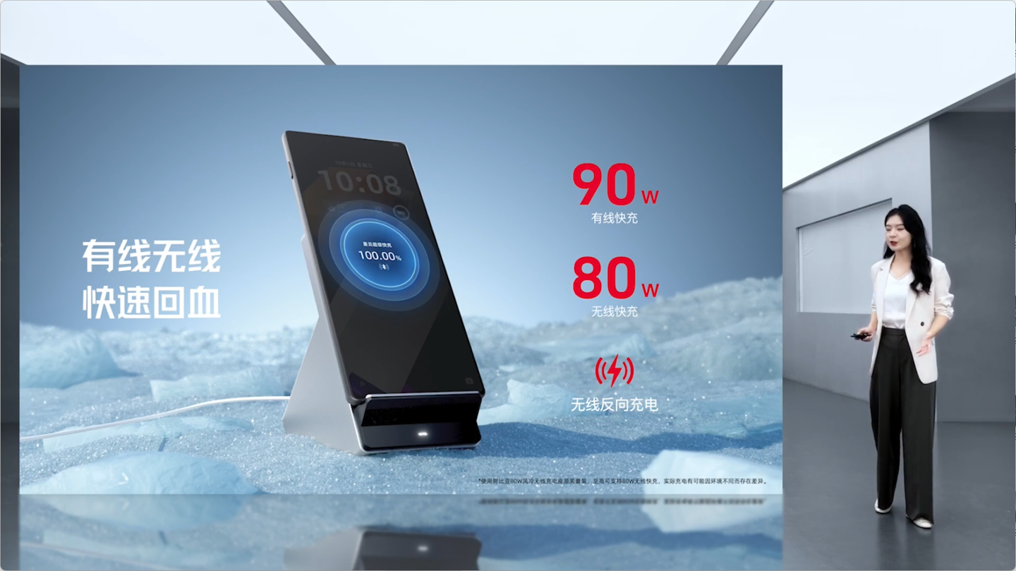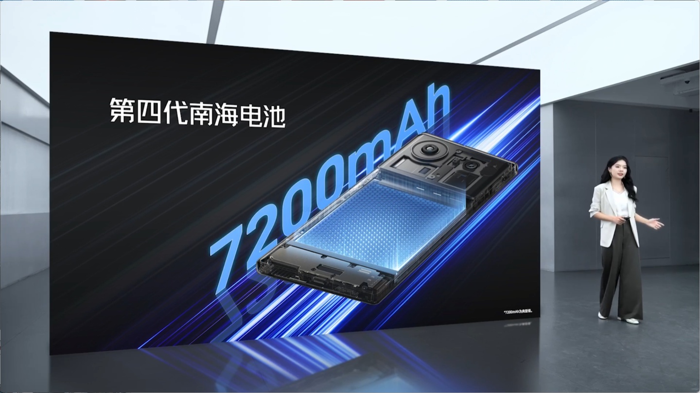 续航方面,这台手机搭载 7200mAh 第四代南海电池,配备 AI 智能省电技术,支持 90W 有线快充 + 80W 无线快充,配备无线反向充电。