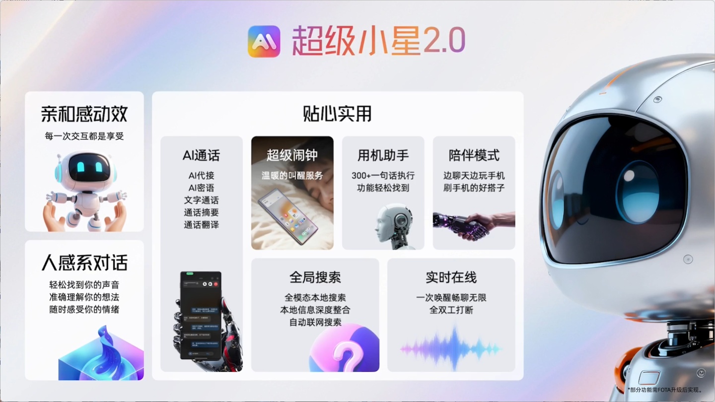 系统方面,新机搭载全新进化的星云 AIOS 2,内置超级小星 2.0,自带炫彩流光界面,内置声纹识别算法、降噪算法,号称可在公众场合下“轻松找到你的声音”,无需大声说话就能让 AI 听清,可根据环境随时调整声音音调、音色,适配超级闹钟,提供“人感系叫醒服务”。