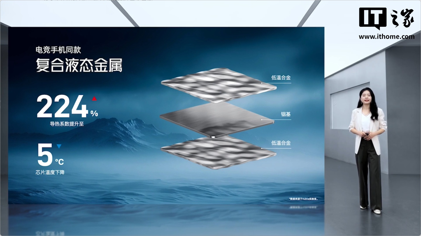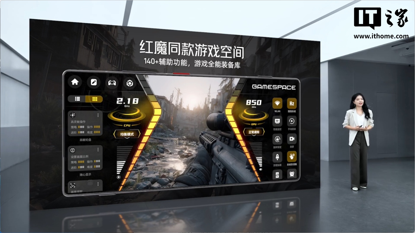 散热方面,这款手机配备红魔电竞手机同款的复合液态金属,可让芯片温度下降 5 度,搭载超大 3D 冰钢 VC 均热板,面积提升 35%,还配有红魔同款的游戏空间,内置 140 + 辅助功能。