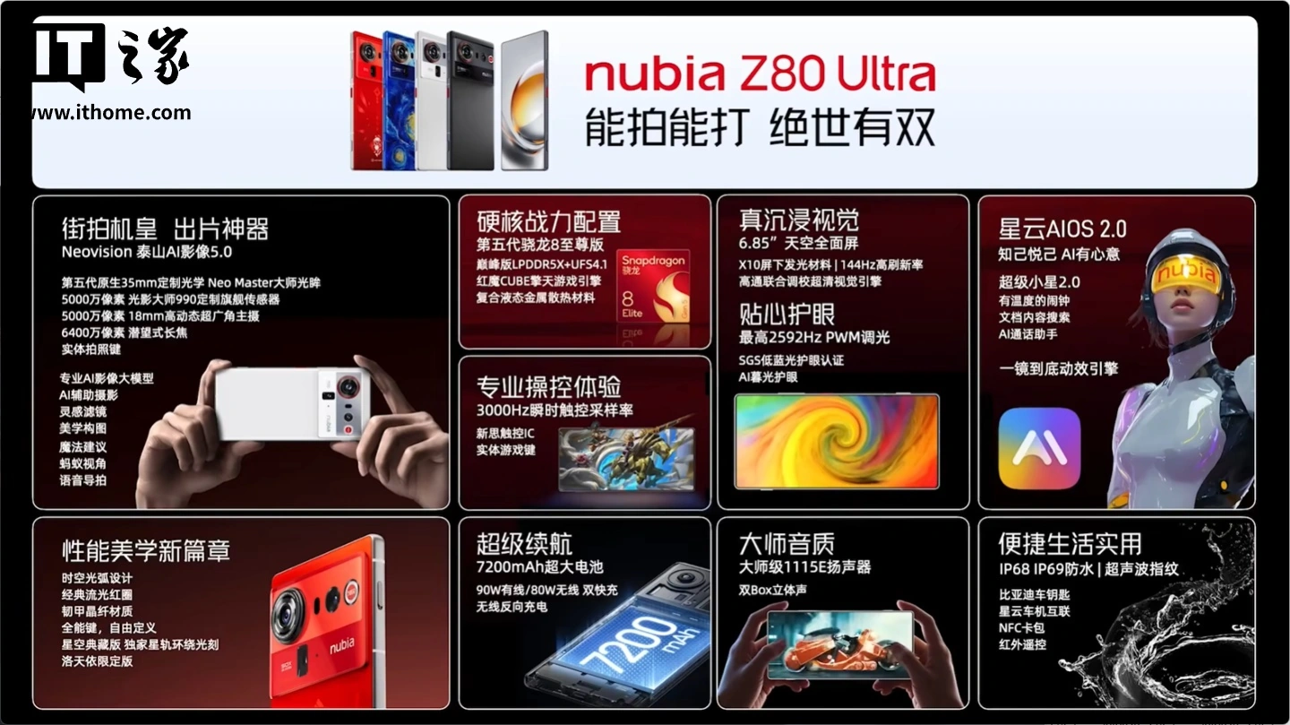 IT之家 10 月 22 日消息,努比亚今天举行新品发布会,推出 Z80 Ultra 手机,搭载 35mm 大师光眸主摄,配备第五代骁龙 8 至尊版芯片,还可选配专属摄影套装,售价 4999 元起。