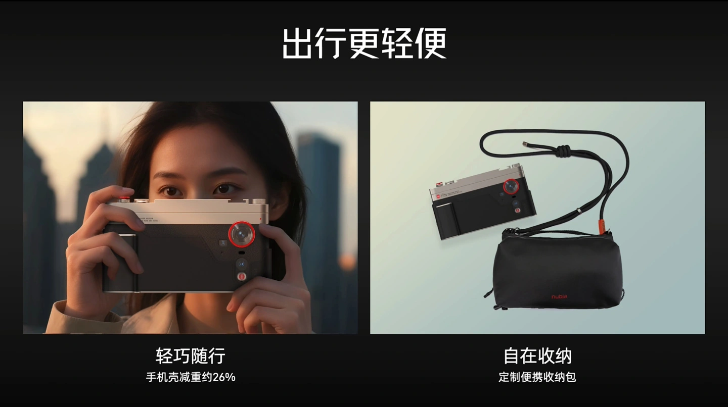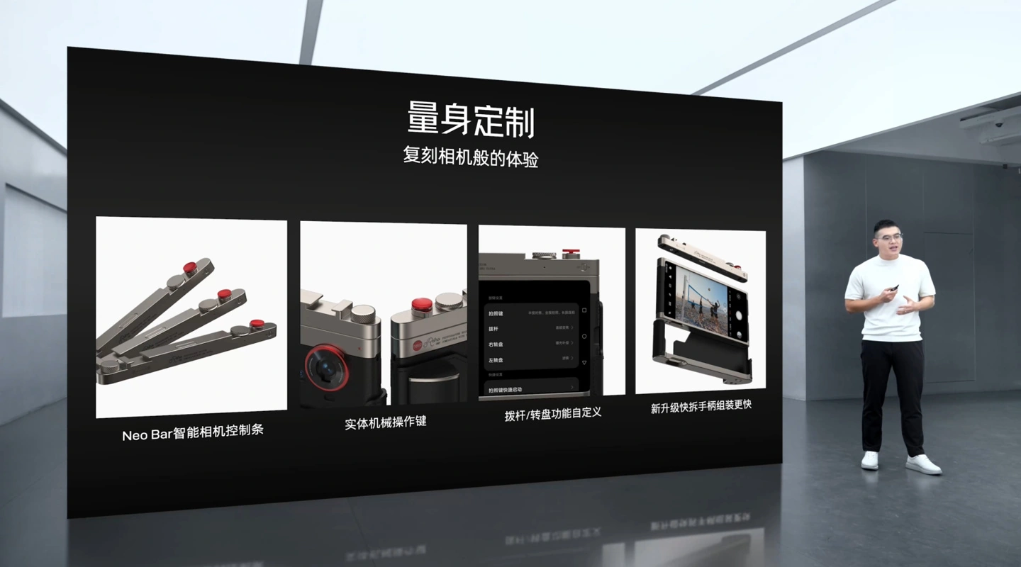 外观上,其采用科技纳米皮、钛色铝合金边框、头层牛皮真皮手柄,打造温润细腻的质感。同时,其搭载“量身定制”的智能相机控制条,还配备了实体机械操作键、以及可自定义功能的拨杆和转盘。