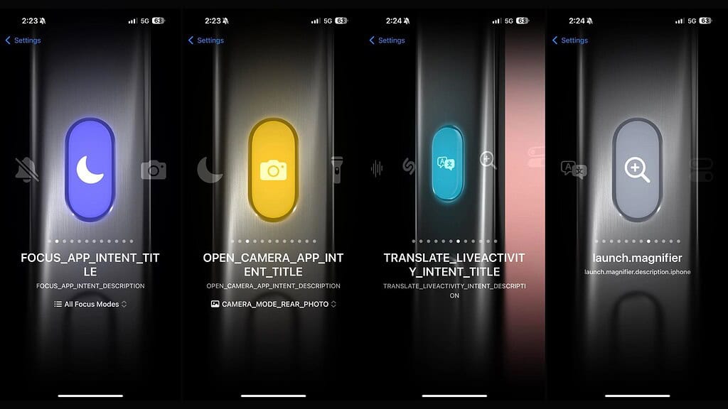具体来看,当用户滚动浏览“操作按钮”可设置的快捷功能时,包括专注模式、相机、手电筒、Shazam 和翻译在内的大部分选项,其名称均以“大写字母 + 下划线”的格式呈现。