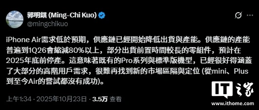 IT之家 10 月 23 日消息,天风国际证券分析师郭明錤今日表示,苹果 iPhone Air 的需求不及预期,供应链产能将缩减 80% 以上。