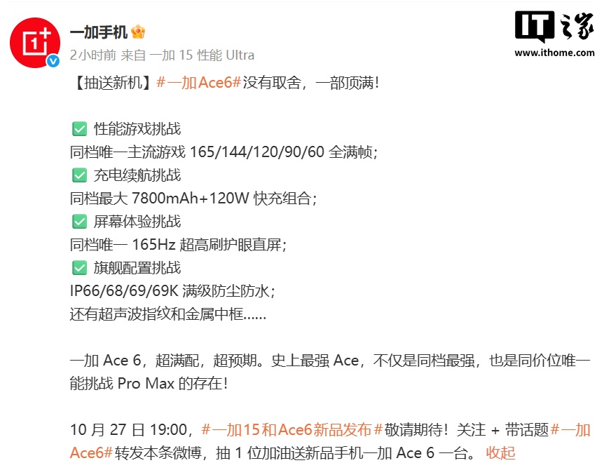 一加新品发布会已定档 10 月 27 日晚 19 点,预计将发布一加 15、Ace 6 手机及各种配件产品,IT之家届时将在第一时间带来详细报道。