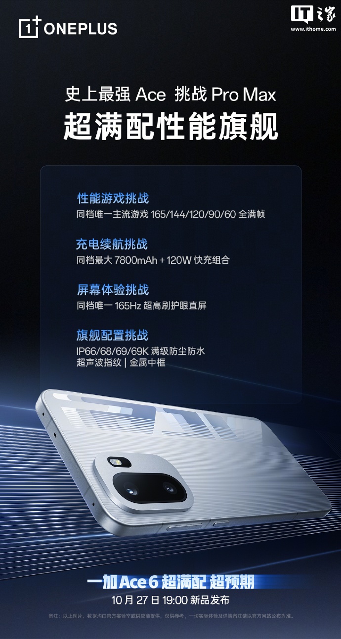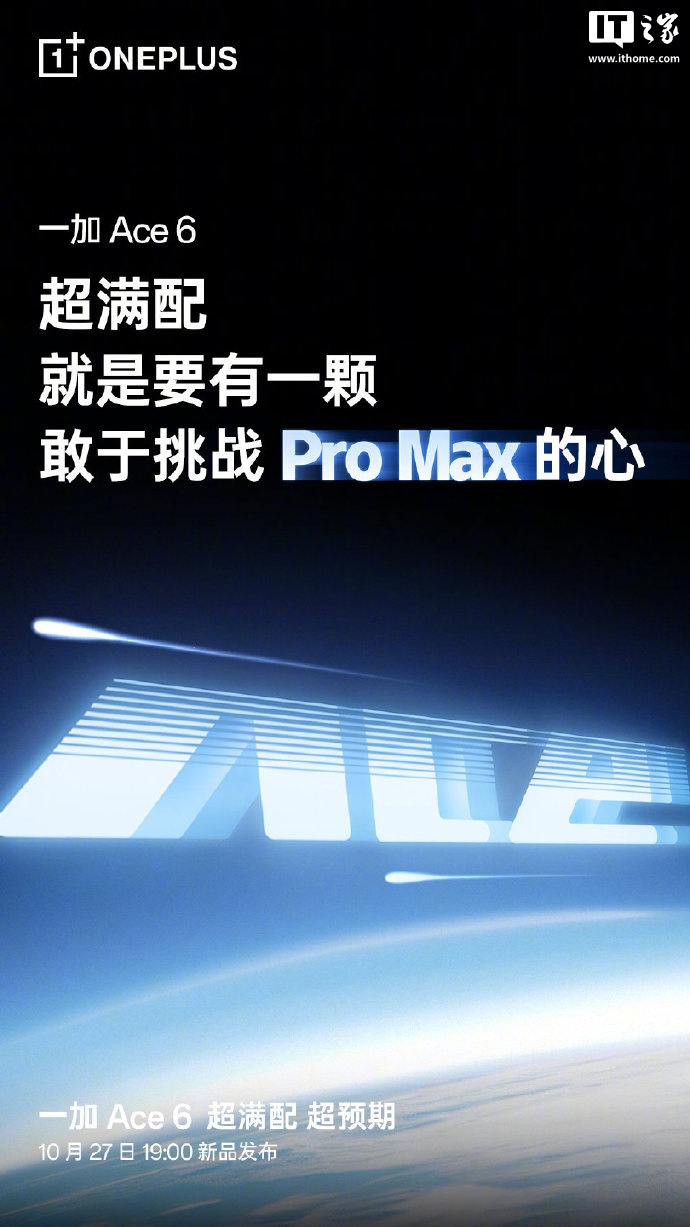 IT之家 10 月 23 日消息,一加官方今天在微博发布预热,宣称 Ace 6 手机将搭载同挡位唯一 165Hz 超高刷护眼直屏,10 月 27 日晚 19 点正式发布