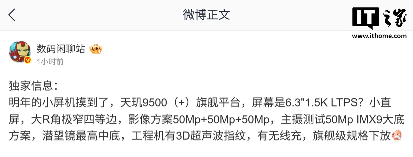 IT之家 10 月 23 日消息,博主 @数码闲聊站今天在微博透露,某厂明年推出的小屏手机将搭载天玑 9500(+)旗舰平台。