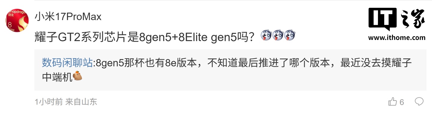 ”,博主回复道:“没有”;另一名用户则询问道:“耀子 GT2 系列芯片是 8gen5+8Elite gen5 吗?