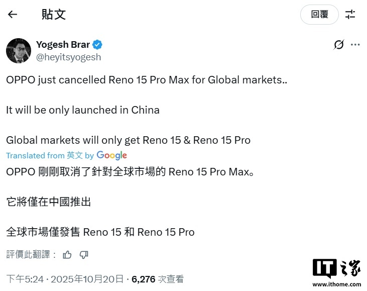 根据此前的爆料,OPPO Reno 15 系列将推出一款 Pro Max 机型。消息人士 Yogesh Brar 于 10 月 20 日在 X 平台发文,称 OPPO 刚刚取消在全球市场发售 Reno 15 Pro Max,意味着这款手机将在中国市场独占,而 Reno 15 系列在全球市场上就只剩下标准版和 Pro 版。