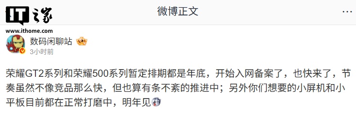 IT之家 10 月 24 日消息,据 @数码闲聊站 今日爆料,荣耀 GT2 系列和荣耀 500 系列暂定排期都是年底,开始入网备案了。另外,小屏机和小平板目前都在正常打磨中,明年见。