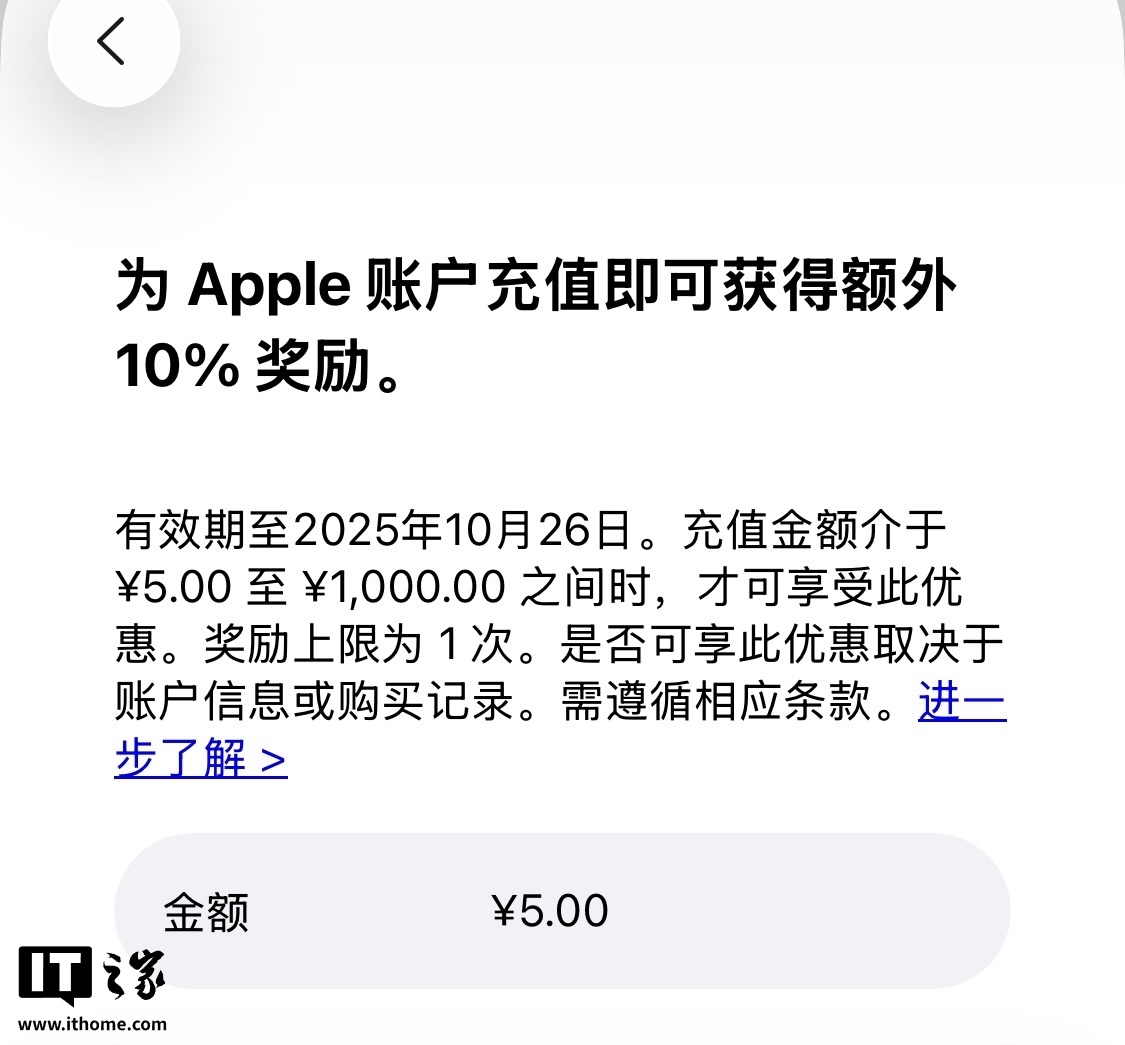 IT之家 10 月 24 日消息,据IT之家小伙伴投稿,苹果 App Store 国区现已开启充值加赠活动,可获得额外 10% 加赠奖励,截止至 10 月 26 日。