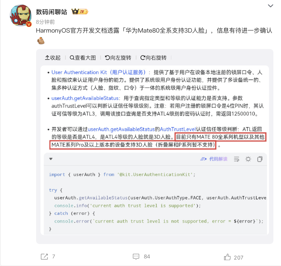 IT之家 10 月 25 日消息,据鸿蒙 HarmonyOS 官方开发文档,其中显示“华为 Mate 80 全系支持 3D 人脸”,不过对此博主 @数码闲聊站 补充称相应信息“有待进一步确认”。