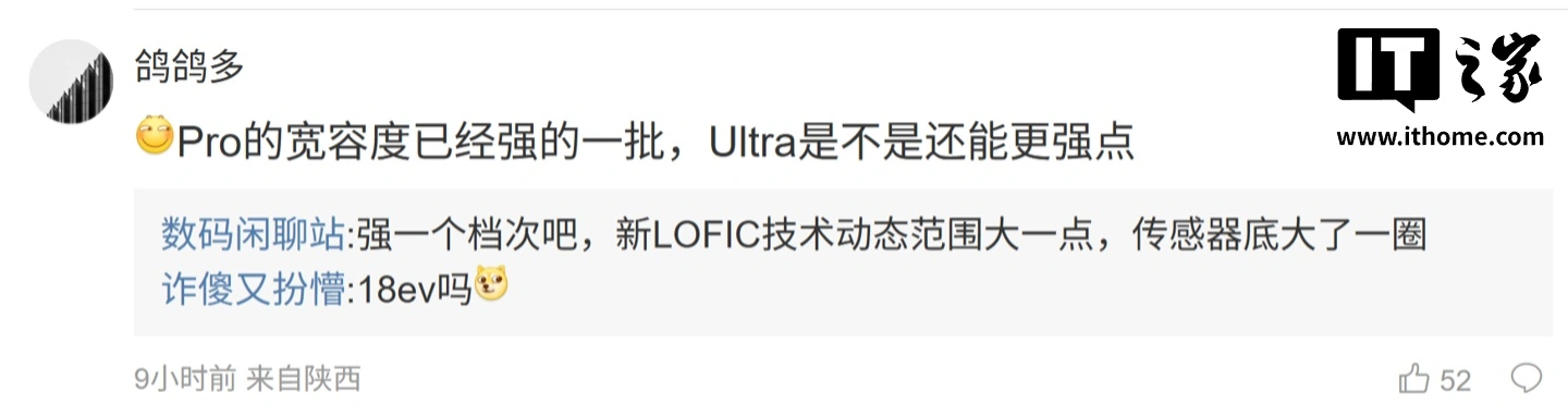 Pro 的宽容度已经强的一批,Ultra 是不是还能更强点”,博主回复道:“强一个档次吧,新 LOFIC 技术动态范围大一点,传感器底大了一圈”。