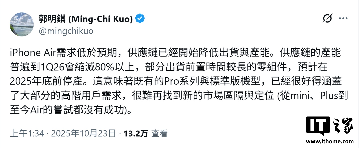 几天后的 10 月 22 日,分析师郭明錤(Ming-Chi Kuo)也表示,供应链已开始缩减 iPhone Air 的生产能力,供应链的产能普遍到 2026 年第 1 季度会缩减 80% 以上。