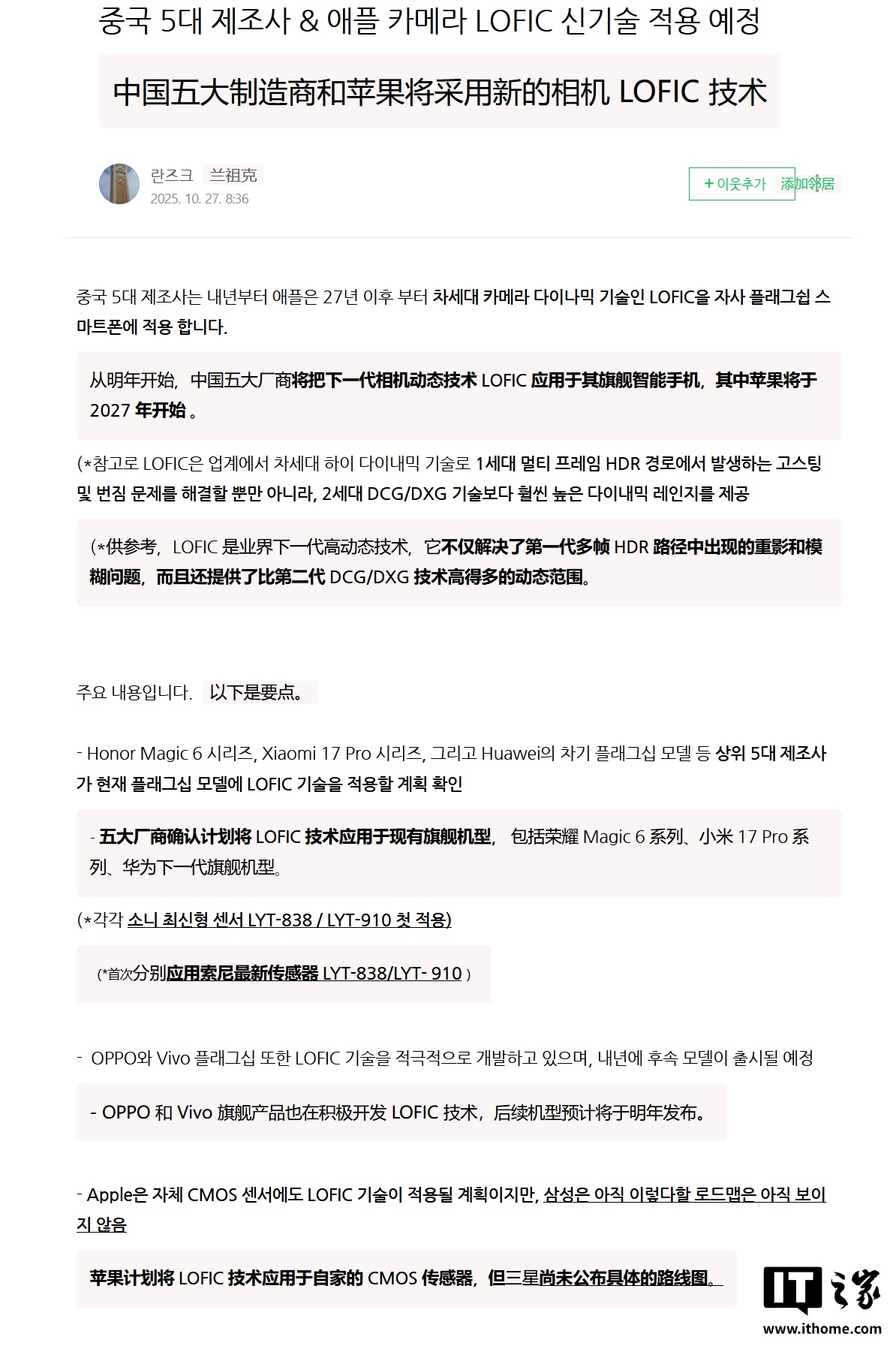 IT之家 10 月 28 日消息,消息源 yeux1122 昨日(10 月 27 日)发布博文,苹果正自研 LOFIC 图像传感器,并有望首次装备在 2027 年推出的 iPhone 20 周年纪念版上。