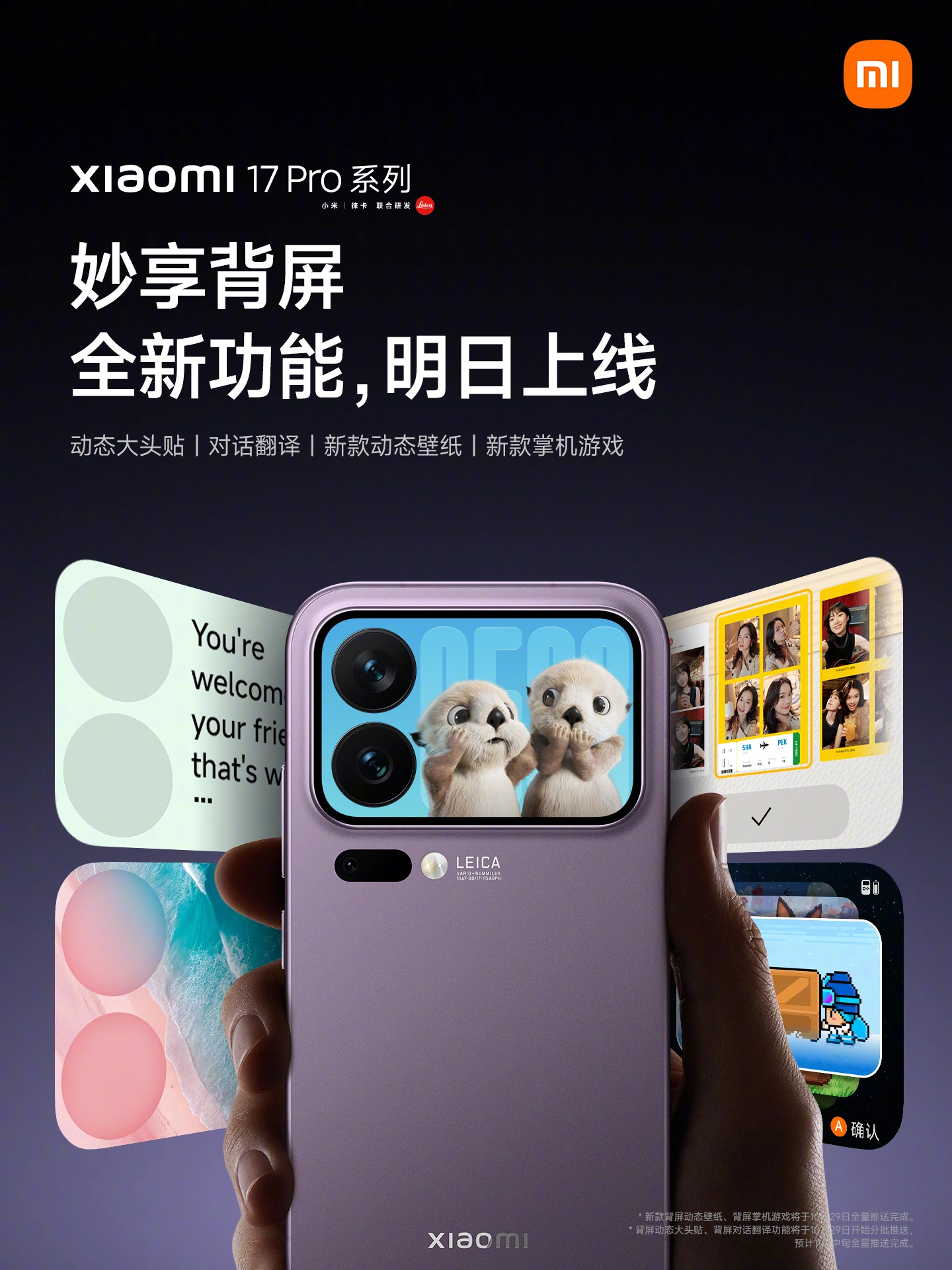 另外,小米 17 Pro 系列手机明天还将更新背屏「大头贴模式」玩法,支持拍摄动态照片。