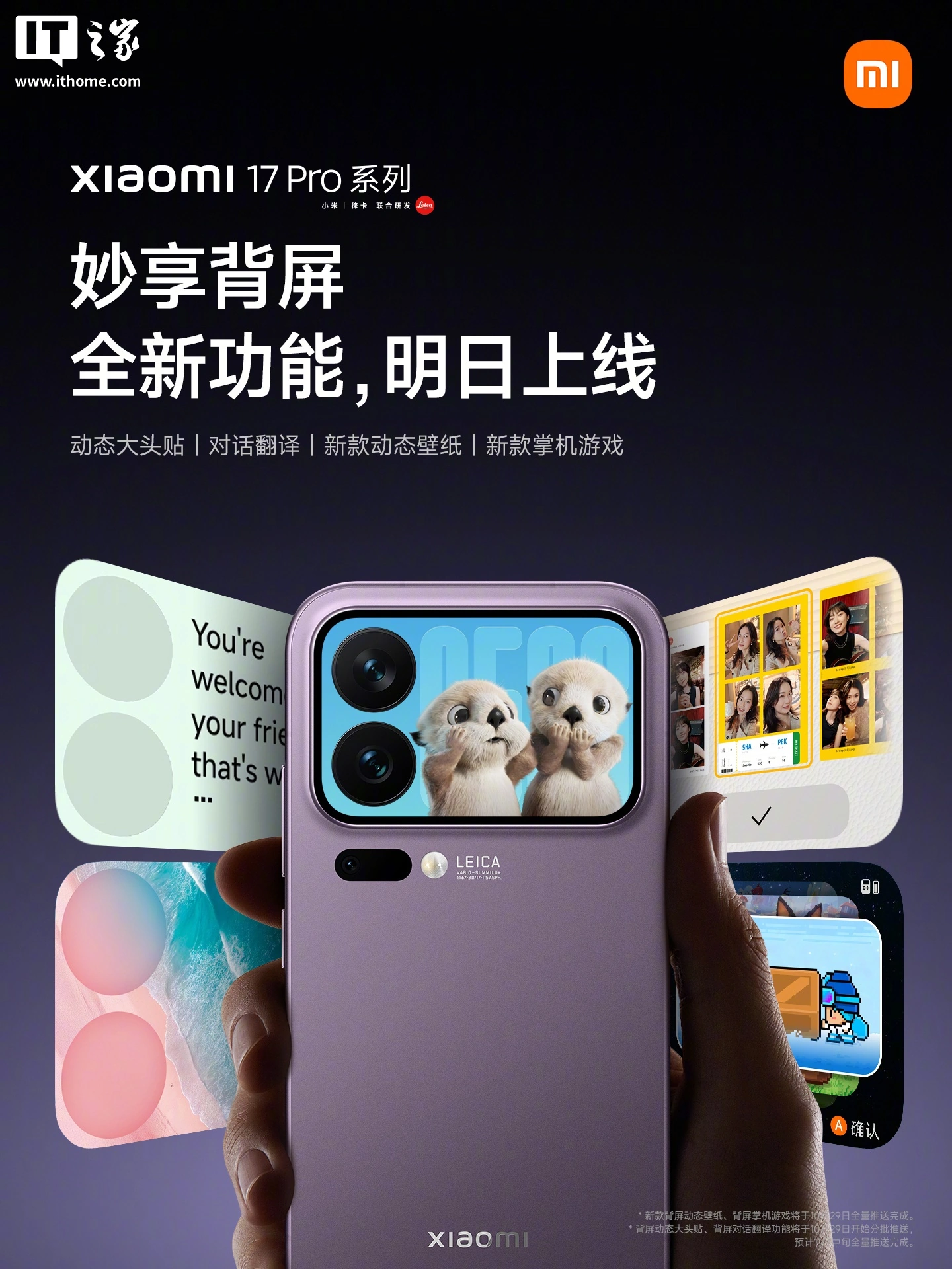 IT之家 10 月 29 日消息,小米澎湃 OS 官方微博今日宣布,小米 17 Pro 系列手机妙享背屏新功能开始陆续更新,含动态大头贴、对话翻译、动态壁纸、掌机游戏等。