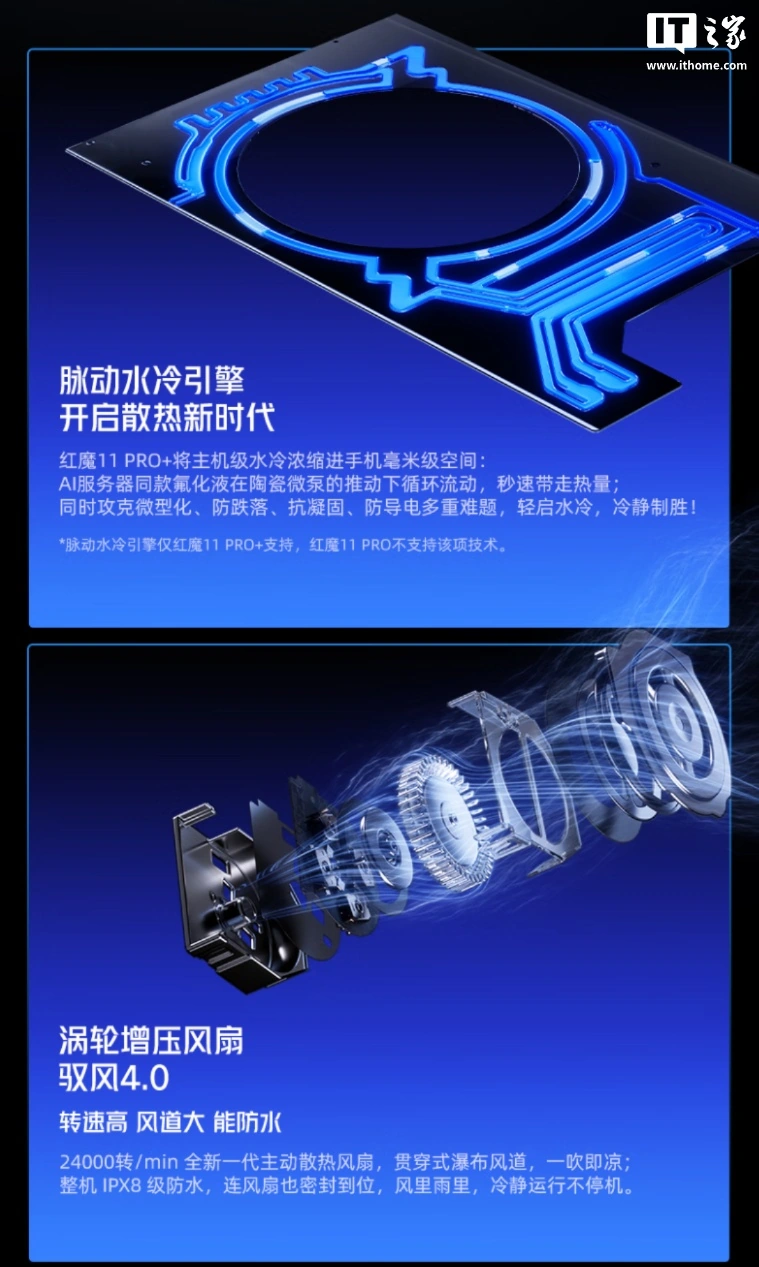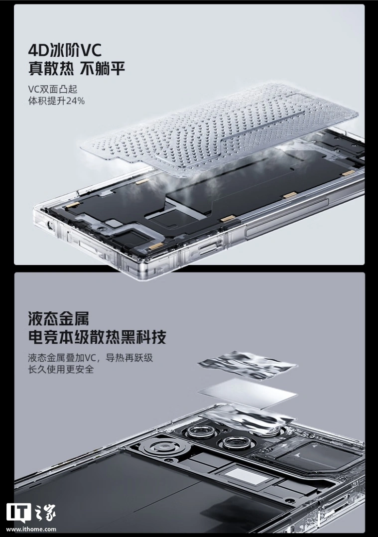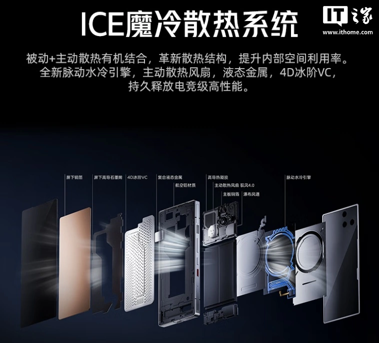 该机是行业首款风水双冷手机,内部配备 AI 服务器同款散热液,液态范围-60℃~108°C,无需担心低温环境,行业首创超低温键合工艺、独家高分子缓冲材料,采用独家微型陶瓷泵,功耗低至 80mW,输出压力达 100kPa。