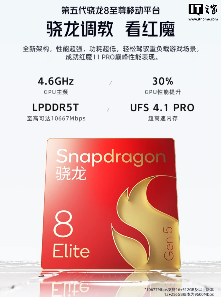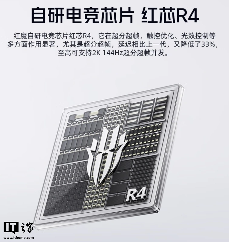 该机搭载第五代骁龙 8 至尊版芯片,CPU 主频可达 4.6GHz,GPU 性能提升 30%,搭配 LPDDR5T 内存(IT之家注:最高频率可达 10667Mbps)和 UFS 4.1 Pro 闪存,拥有自研电竞芯片红芯 R4,至高支持 2K 144Hz 超分超帧并发,适配 200 + 热门游戏。