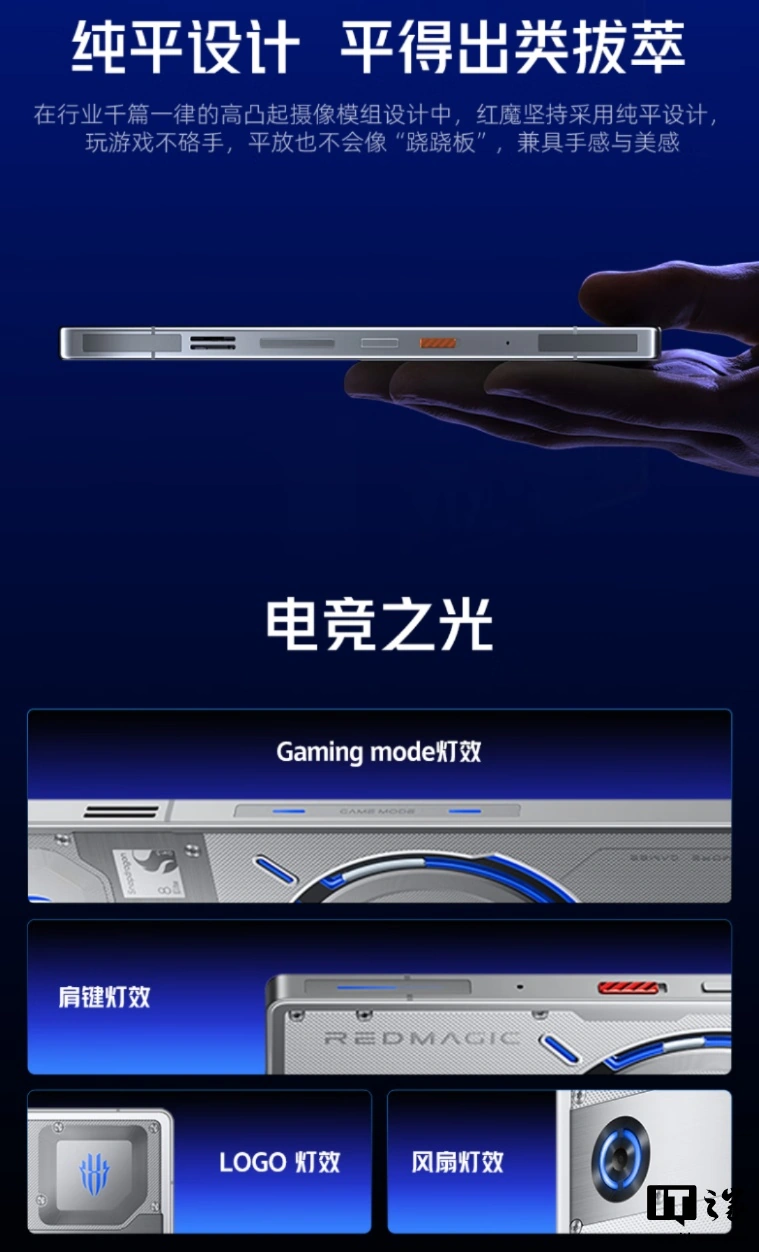 红魔 11 Pro+ 延续了透明设计 DNA,背板拥有高通骁龙 Logo、红魔 Logo 和电竞灯效,水冷结构采用透明可视化设计,启动之后圆环会缓缓转动,带来“炫酷科技感”,手机整体采用纯平设计,放在桌面上是平整一块,不会有“跷跷板”现象。