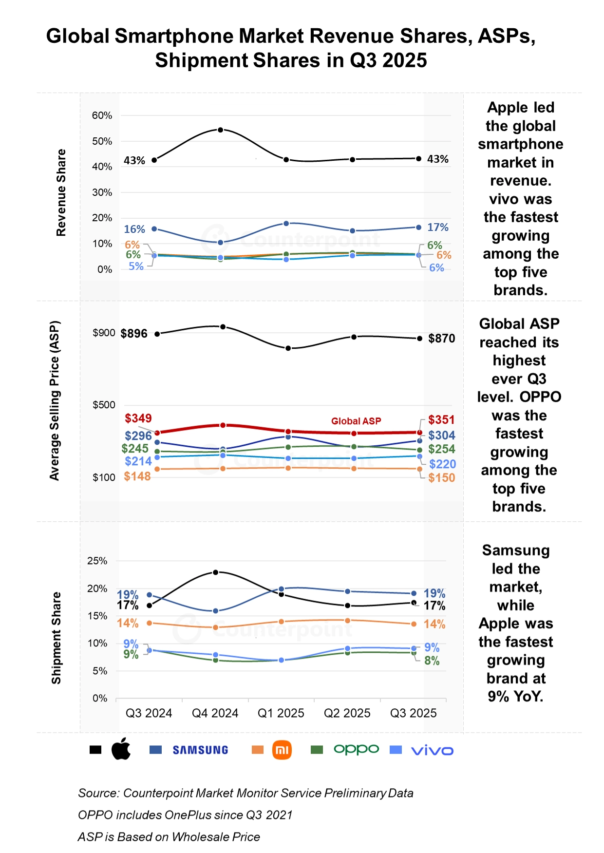 OPPO 的平均售价在前五大厂商中涨幅最高,同比增长 3.4%,营收增长 1%。Reno 14 系列销量强劲,高端机型的扩充也带动了整体售价上扬。