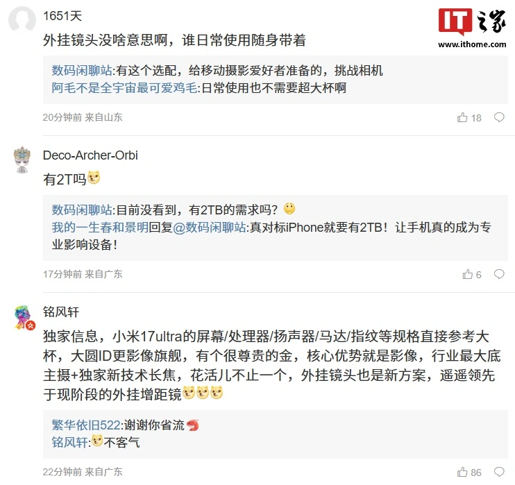 结合评论区讨论来看,该机预计为小米 17 Ultra。另外有用户询问是否有 2TB 规格版本,博主表示:“目前没看到,有 2TB 的需求吗?”还有用户称“外挂镜头没啥意思”,博主回复:“有这个选配,给移动摄影爱好者准备的,挑战相机。”