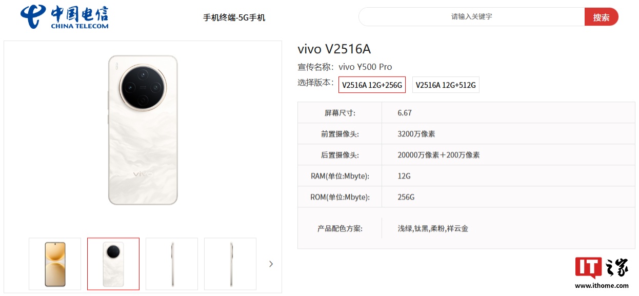IT之家注意到,型号为“vivo V2516A”的 vivo Y500 Pro 手机已现身中国电信终端产品库。该机提供 12GB+256GB、12GB+512GB 两种存储规格,拥有浅绿、钛黑、柔粉、祥云金四种配色,产品零售价格尚未公布。