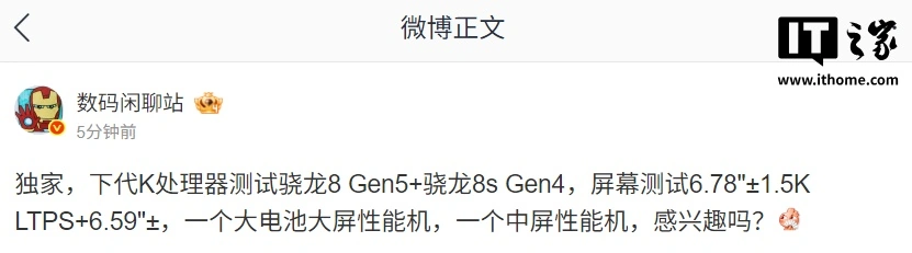 下代 K 处理器测试骁龙 8 Gen5 + 骁龙 8s Gen4,屏幕测试 6.78″±1.5K LTPS+6.59″±,一个大电池大屏性能机,一个中屏性能机