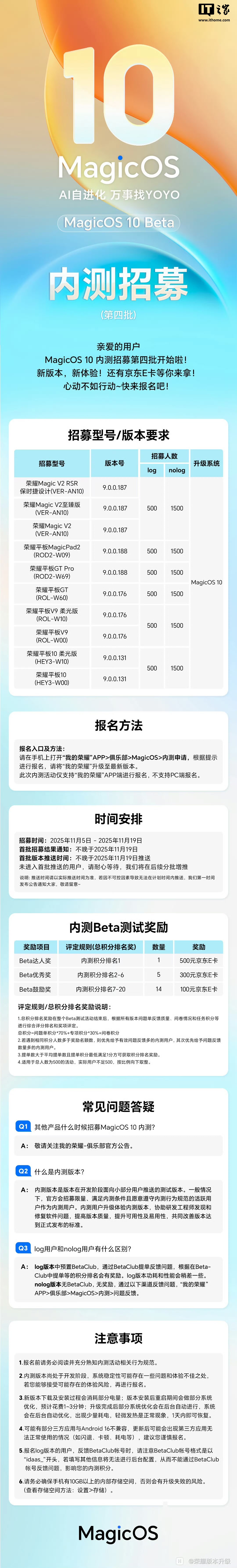 IT之家 11 月 5 日消息,荣耀MagicOS 10 系统第四批内测招募现已开启,覆盖 Magic V2 系列、荣耀平板 V9 等多款设备,招募截至 11 月 19 日,首批版本将在同日(11 月 19 日)推送。