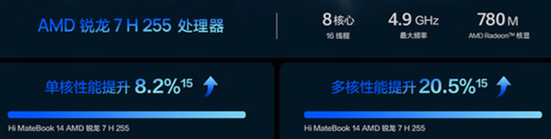 核心配置上,Hi MateBook 14 搭载了 AMD 锐龙 7 H 255 移动处理器。关键点就在于这个“H”—— 这颗基于 4 纳米制程与 Zen 4 架构的 8 大核 16 线程处理器,提供了远超同价位常见低功耗“U”系列处理器的性能。