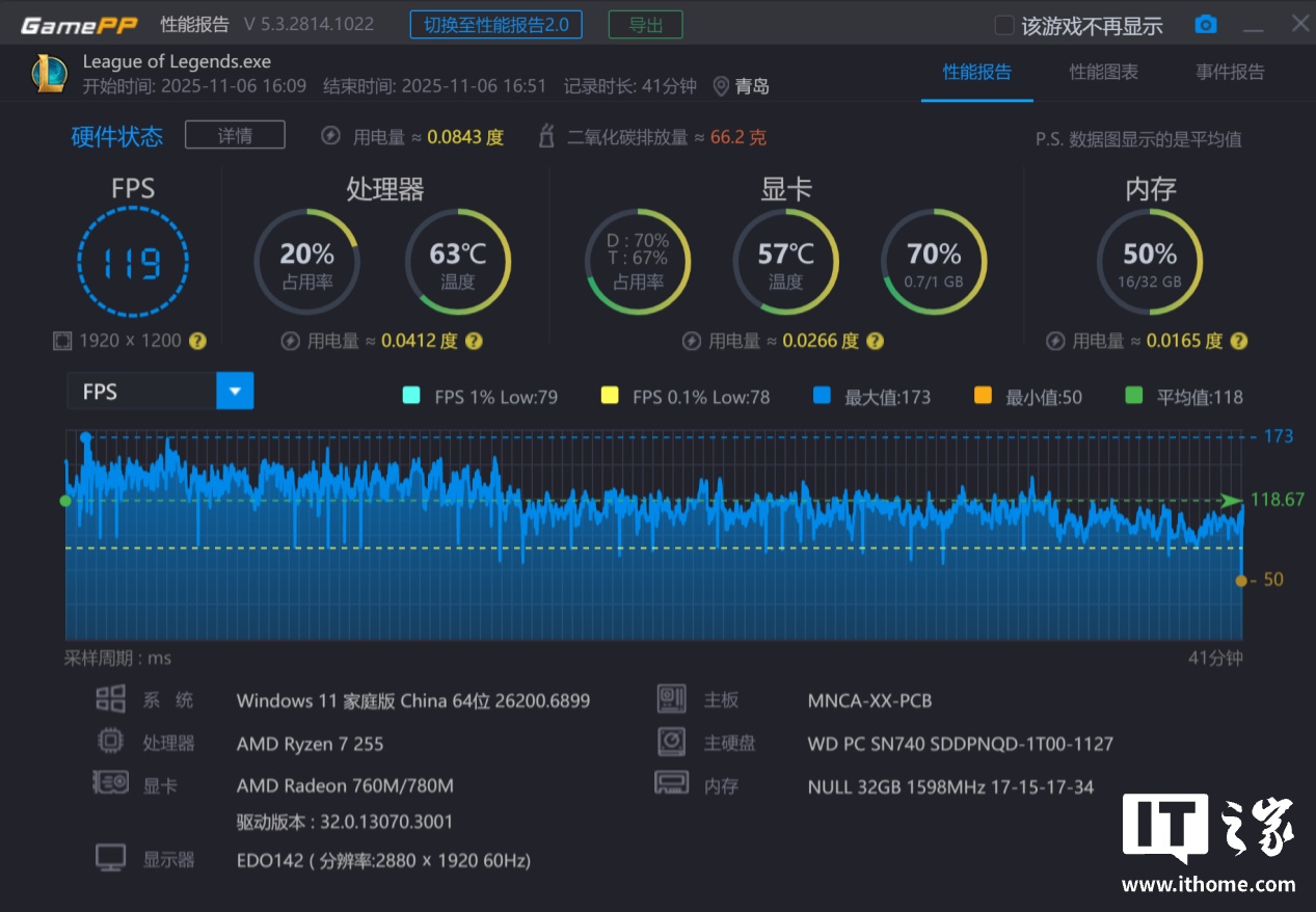 在 1200P 中画质的《英雄联盟》游戏中,平均帧率达到了 119fps,表现同样出众。