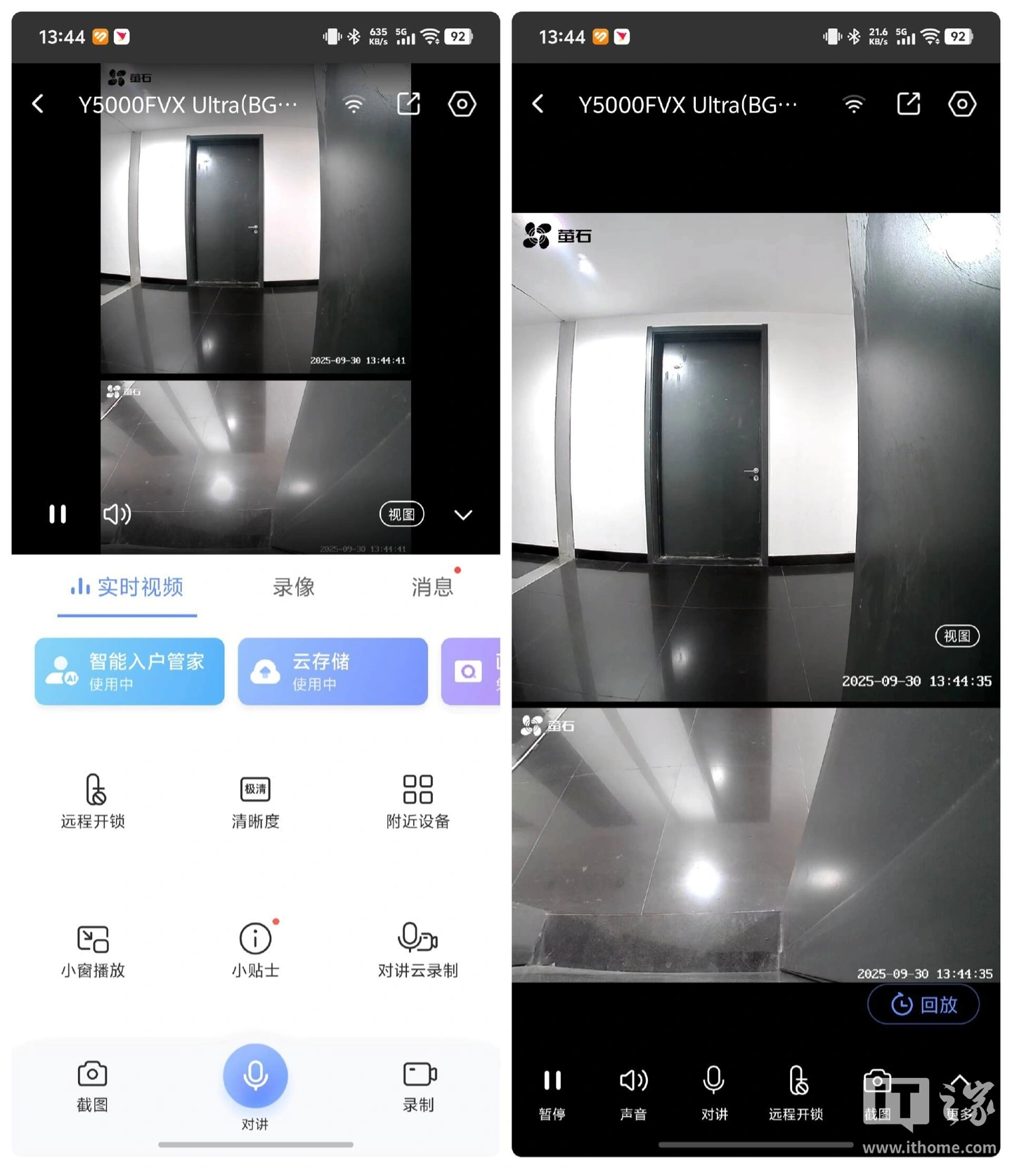 在实际测试中,双摄的画面拼接自然,门外视野范围非常广阔,同时,在楼道昏暗的夜晚其红外夜视功能都能提供清晰的影像。