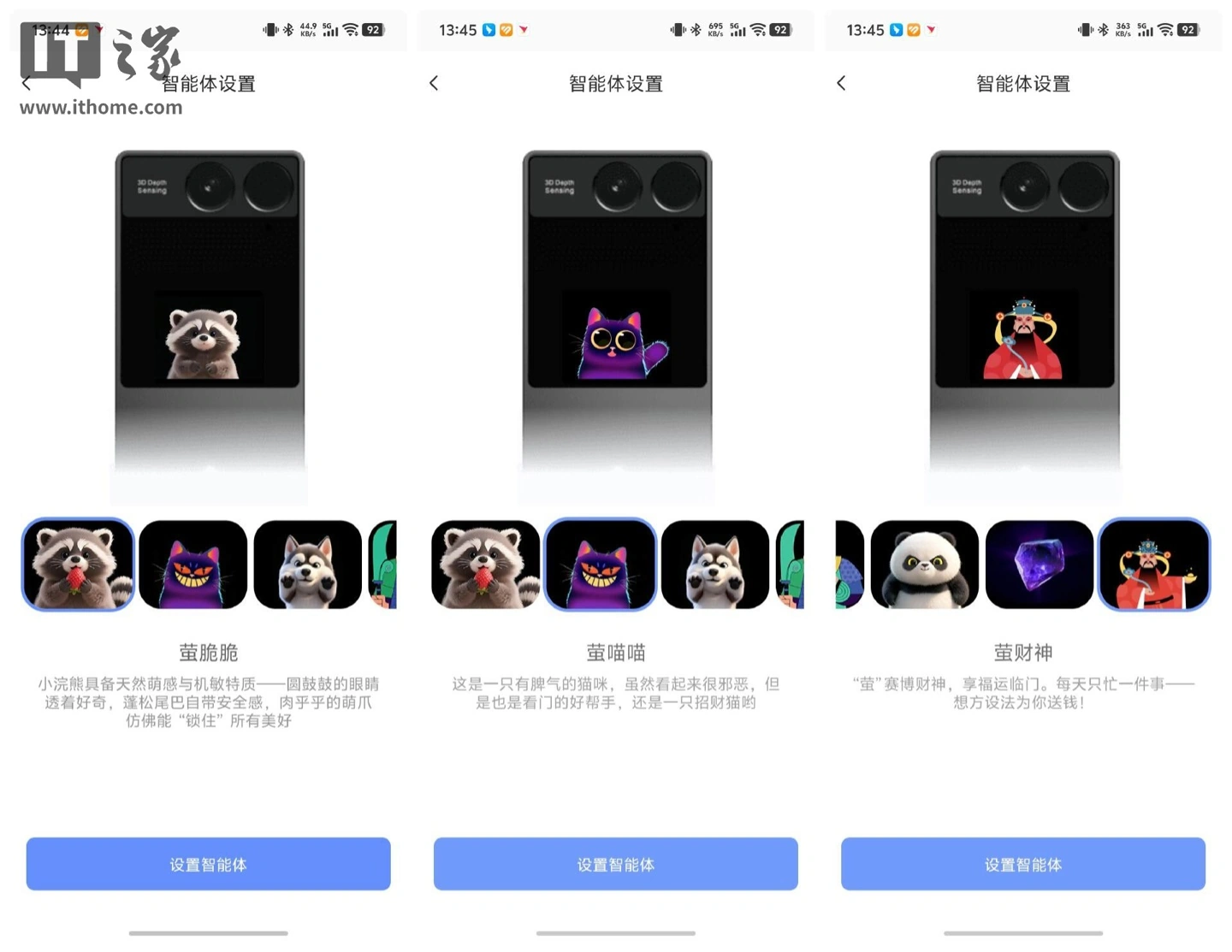 同时,这块屏幕还可以展示 AI 智能体,目前系统内置了 7 种不同的 AI 智能体形象,包括 3D 形象的“萤小哈”、卡通形象的“萤二爷”,以及专属“财神”智能体的萤财神,还有萤喵喵、萤脆脆、萤小团等等,配合语音进行表情展示,非常有意思。