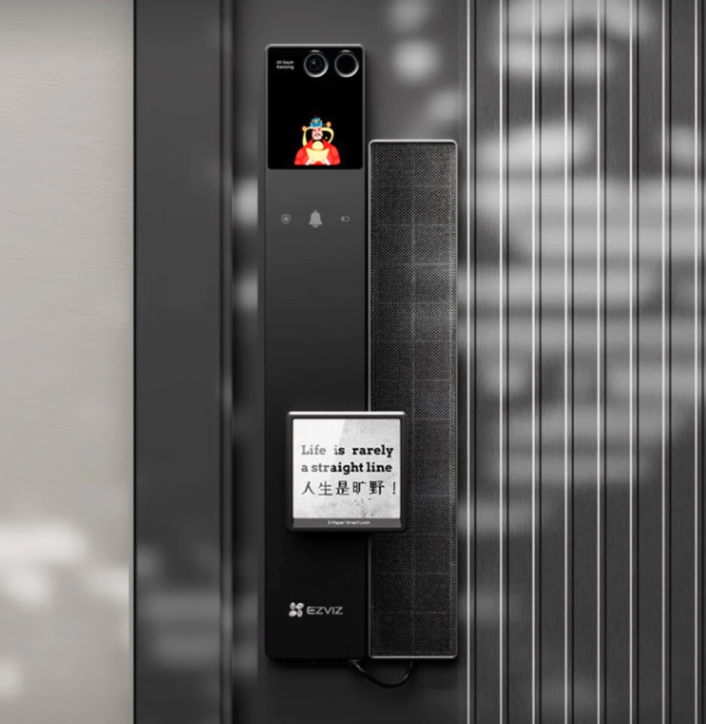 这款产品在延续前代热售型号 Y5000FVX 人脸识别 4.0 模组,全金属机身设计,AI 交互 3.0 系统、双摄双锂电池等核心优势的基础上,行业首创了水墨屏把手,这块耗电极低的水墨屏,既是隐私密码键盘,也可以作为对外展示内容的屏幕。