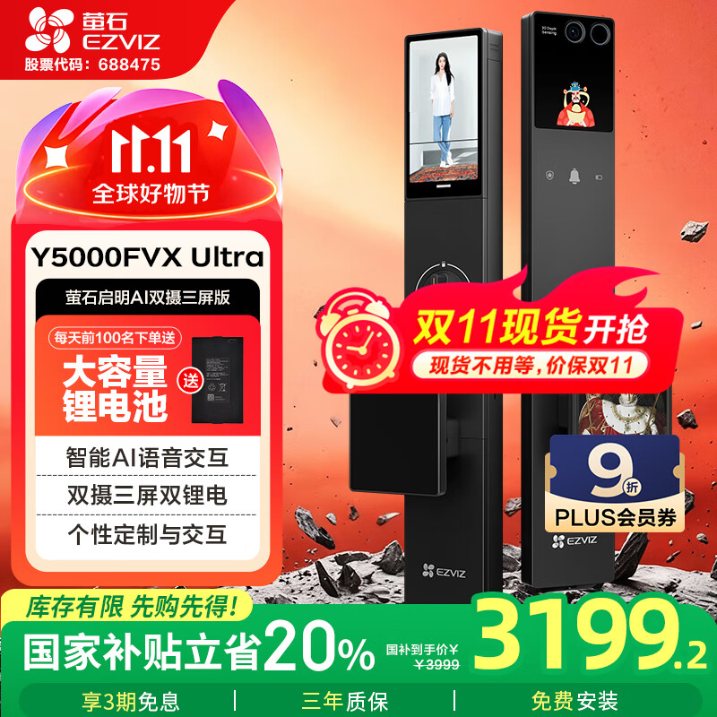 京东萤石启明 Y5000FVX Ultra 智能锁 人脸 AI 智能体支持指纹掌静脉 双摄双可视大屏 家用全自动猫眼视频门锁国补后 3199 元起直达链接