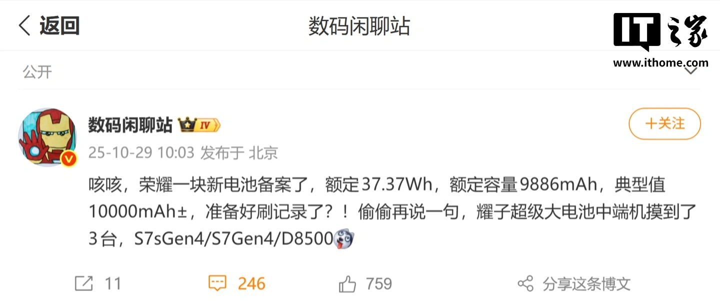 该博主还称 10000mAh± 中端机厚度只有 8.X mm,配备 1.5K LTPS 屏幕,处理器是联发科天玑 8500,拥有抗摔材料机身、光学屏幕指纹,核心亮点是“无敌大电池”,屏幕和性能“也不错”,行业预估“能爆”,排期暂定 2026 年第一季度。结合博主文中暗示和评论区猜测,预计这台手机是荣耀 Power 2。