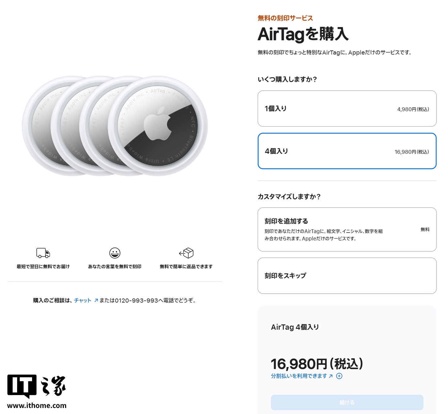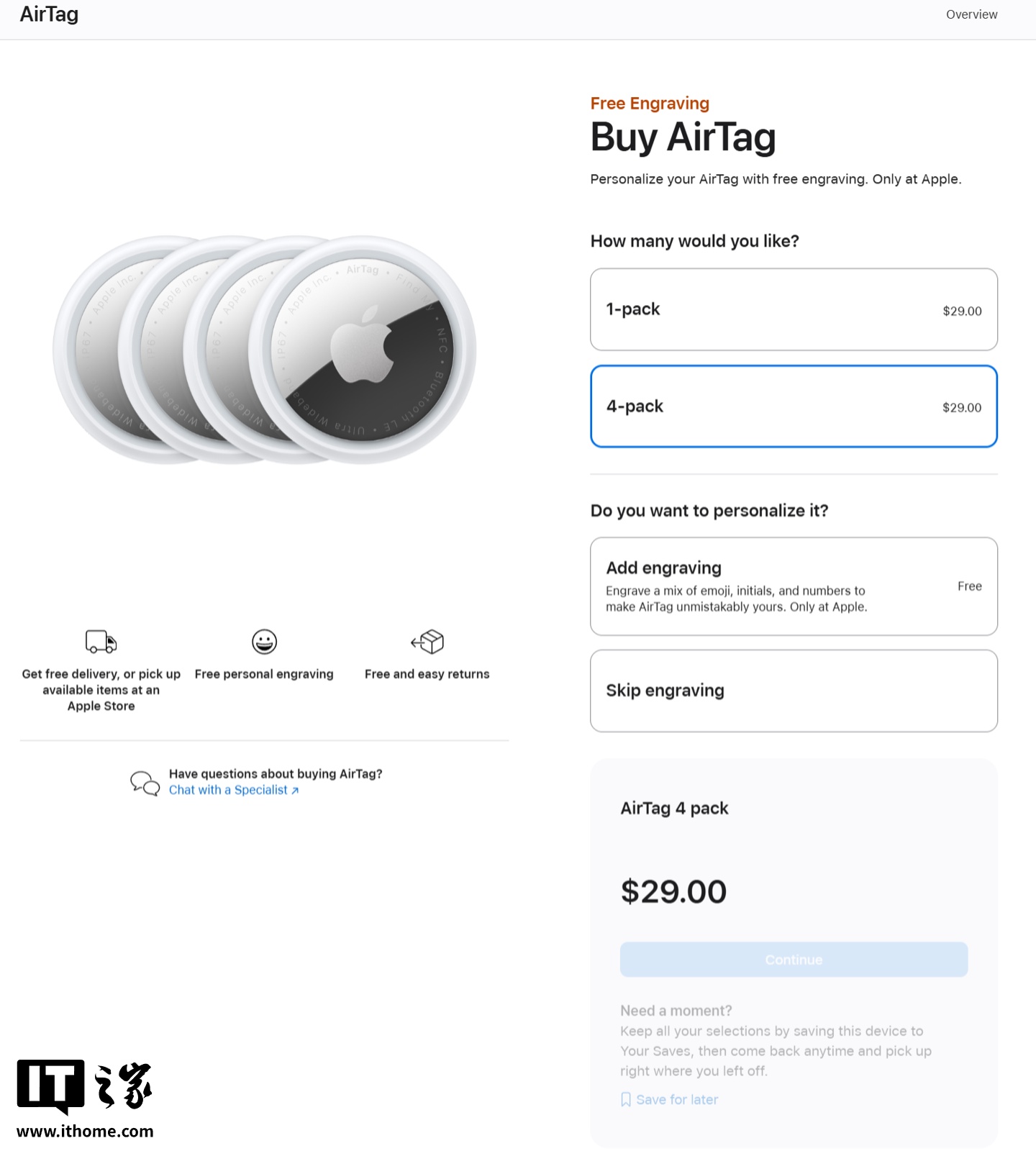 IT之家查询各地区苹果官网后发现,目前美区官网的 4 件装 AirTag 确实还是 29 美元(现汇率约合 206.5 元人民币),但国区、港区、日区的苹果官网都没有这种错误,4 件装 AirTag 都是正常价格。
