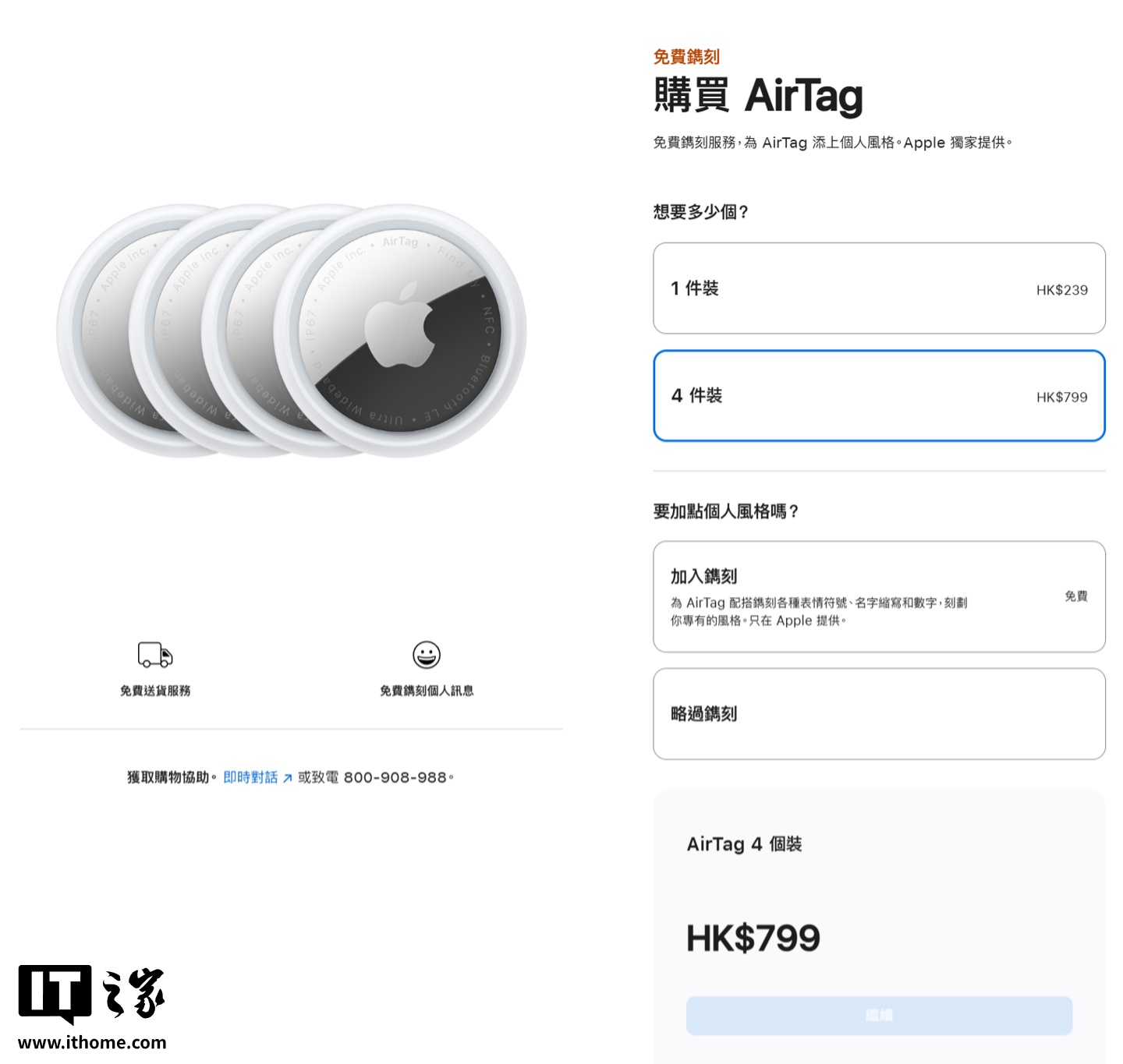 9To5Mac 在测试后发现,目前苹果美国官网的 4 件装 AirTag 确实可以正常下单,但几乎可以肯定的是,只要苹果发现标错价格后就会取消掉这些订单。