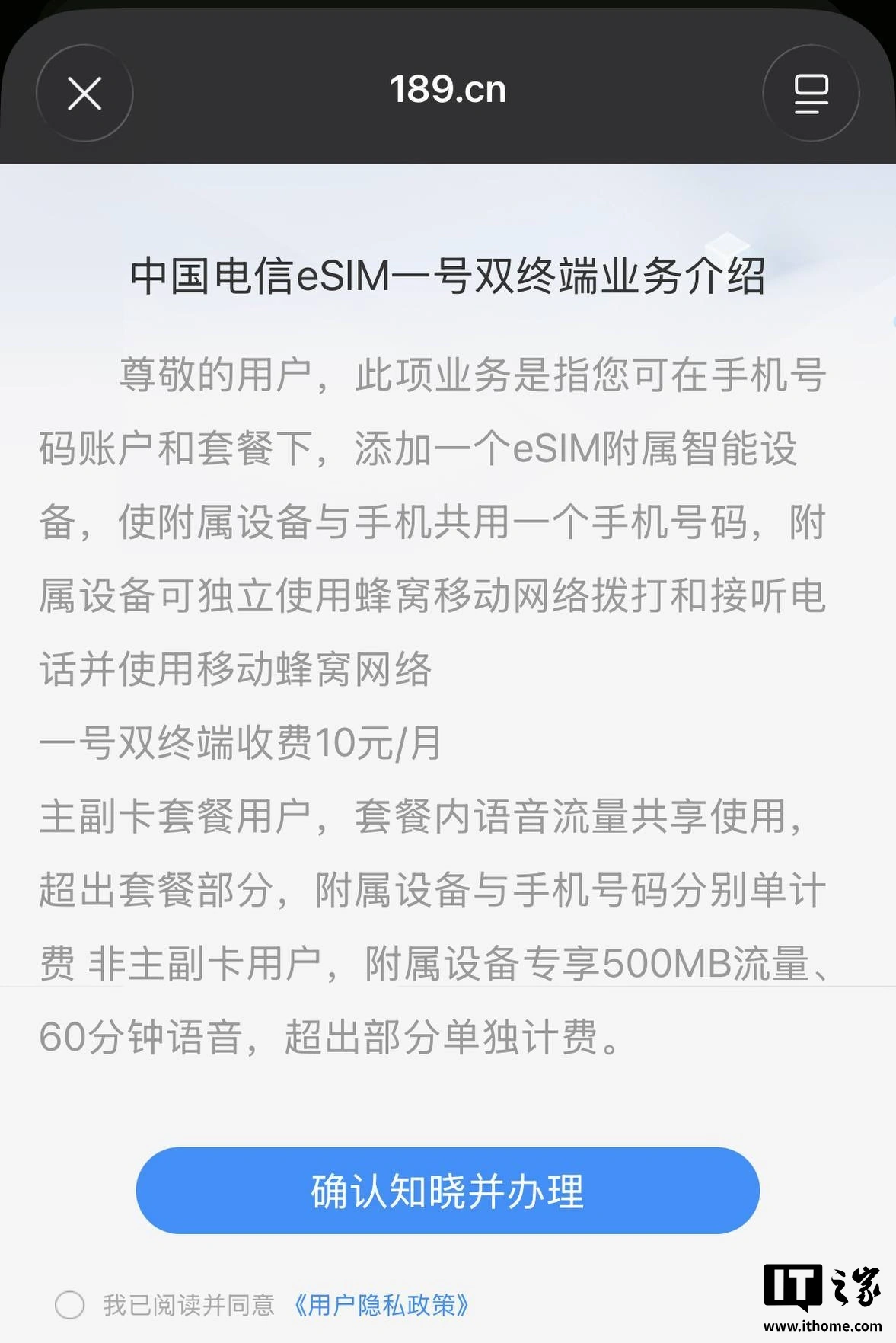 2021 年 6 月 1 日(含)后办理的用户收取一号双终端业务功能费 10 元 / 月。当时安卓手表也可以通过中国电信 App“eSIM 办理”页面进行办理;苹果 Apple Watch 则可直接在手表端开通。
