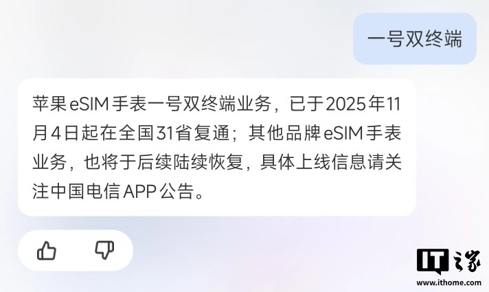 IT之家 11 月 8 日消息,中国电信已于 11 月 4 日在全国恢复开通 Apple Watch 的一号双终端 eSIM 业务,其他品牌的 eSIM 手表仍需等待后续通知。