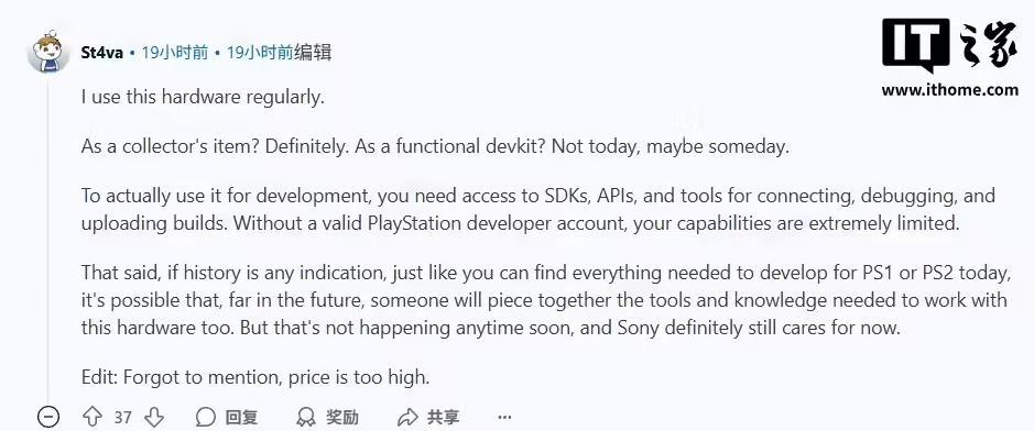 而玩家JamesLondonBritish回复道,索尼已经将这些机器远程封锁,故这些开发机都是“砖头”,买回家也没用。同时另外几位玩家也给出了具体解答,汇总如下: